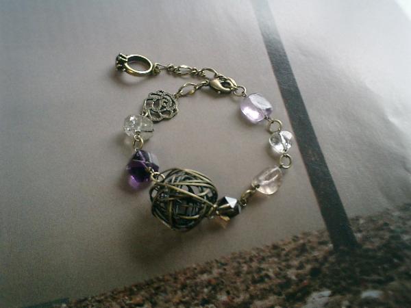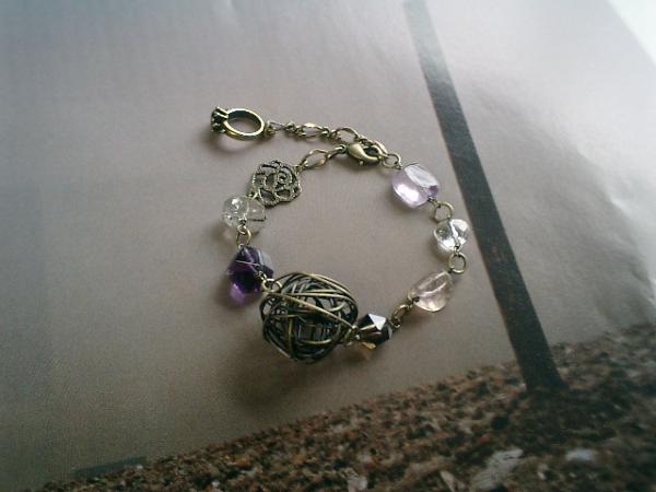 アンニュイな心(?)シリーズです♪シックに華やかに!繊細なアメジストや水晶を集めてさりげなく大人のブレスレットを作りました♪10ミリ位のアメトリンや12ミリ位のアメジストのラフカットや8ミリのヘキサゴンのスモーキークォーツやブラックルチルのラフカットやハートの水晶やワイヤーボールを合わせてシックで華やかな雰囲気です♪ひそやかに可憐にロマンチックしています♪色々なシーンでお使い頂けたらと思います♪長さは全長22センチ位で調節自由です♪お揃いのネックレスも出品しています♪ハンドメイドをご理解頂いてノークレーム、ノーリターンでお願いします!
