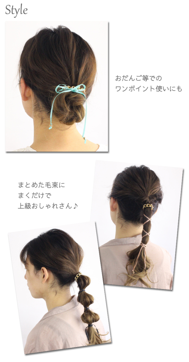 お団子ヘアに巻いたり、タマネギヘアに巻いたり、アレンジ豊富なアイテムです。