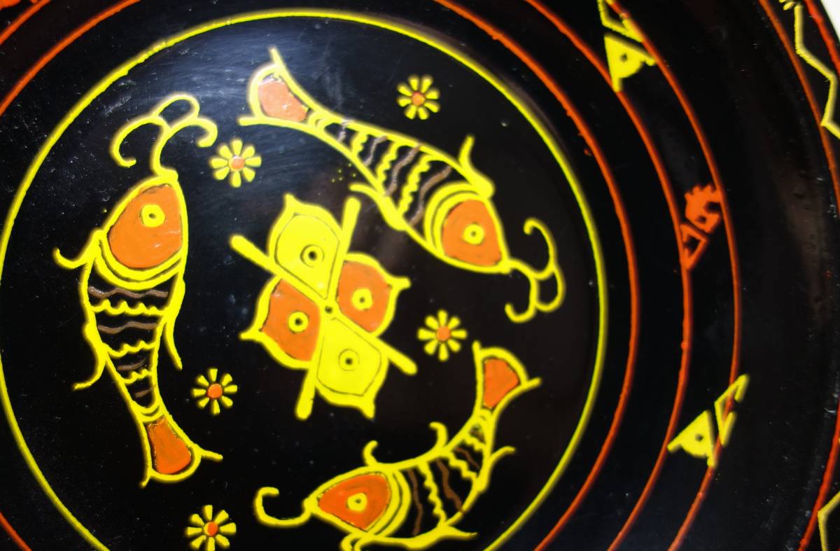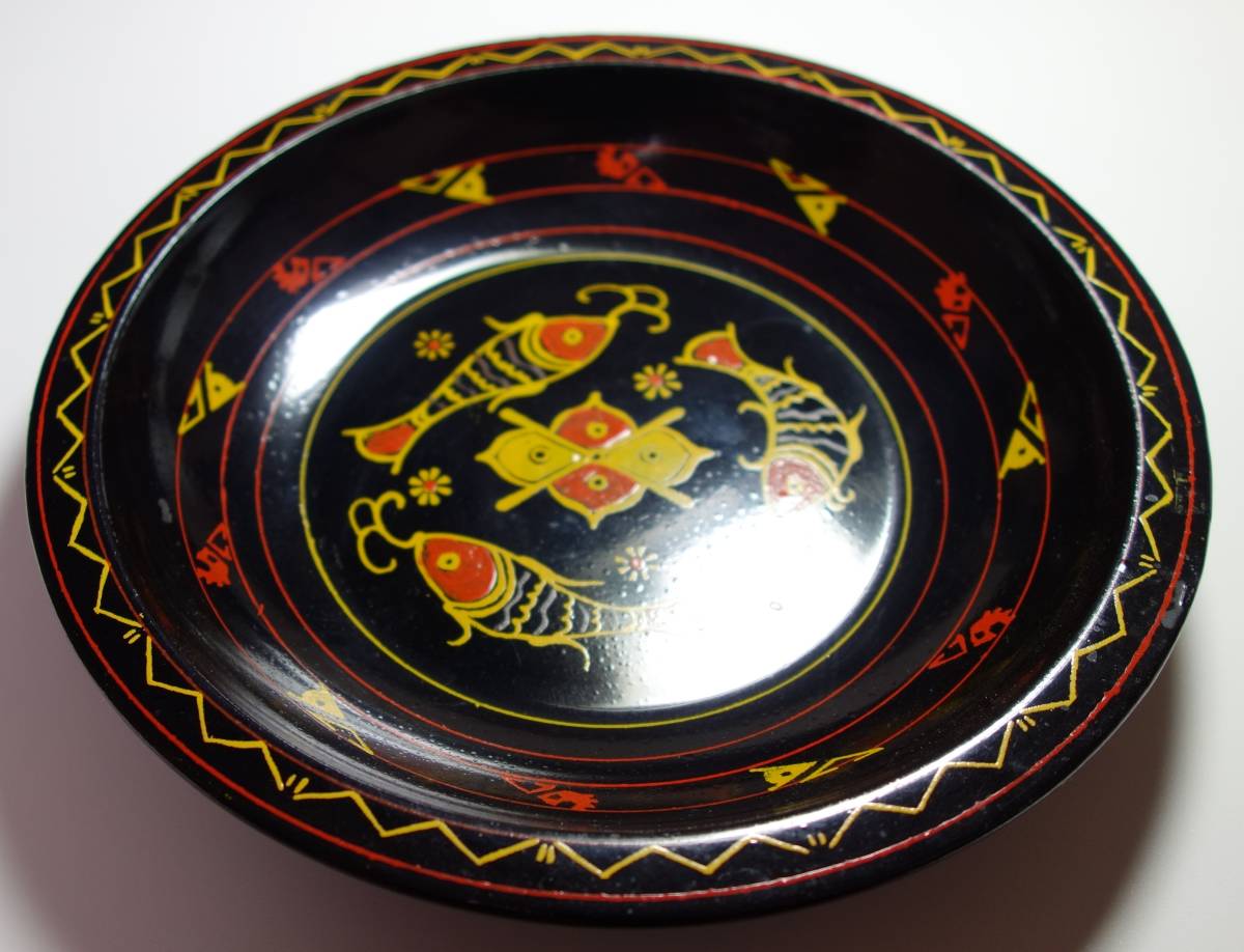 清朝末期 星城 手描き魚+蓮の実図 漆 茶菓子盆 茶道具