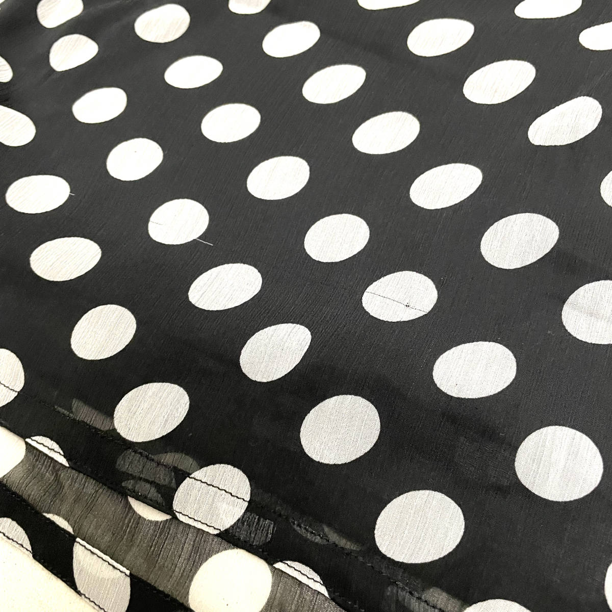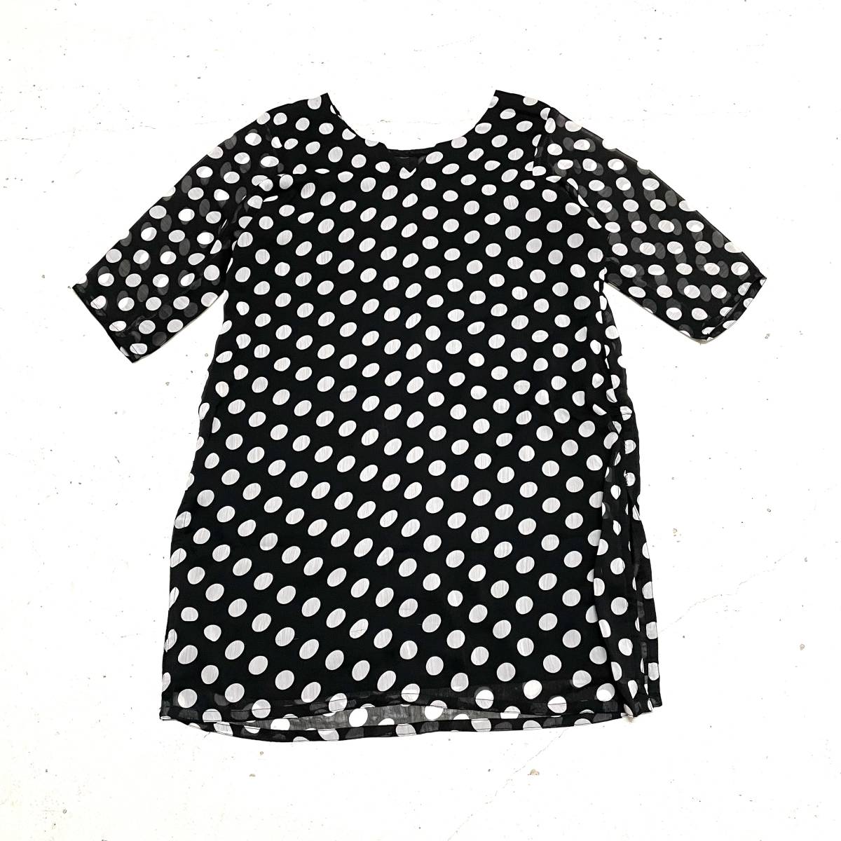 USA古着です。 柔らかいシースルー生地のワンピースチュニックになります。 袖は7分、袖以外には薄い裏地が付いています。 両サイドには深めのスリットが入っているのでパンツを重ね着してチュニックのように着ても良いですね。 背中の開きは広めです。 洗濯済みになります。お探しの方におすすめです。  |    |||