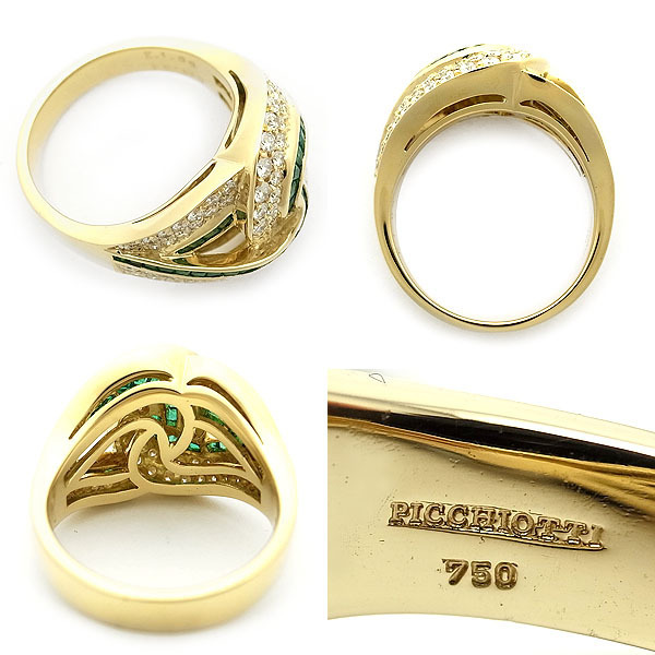 コメント 壮麗な輝きを放つダイヤモンド(計1.54ct)に透き通った鮮やかなグリーンのエメラルド(計1.09ct)のラインが美しいピキョッティ(PICCHIOTTI)のリングです。イエローゴールドとのコントラスがダイヤモンドとエメラルドの織り成す美しさを引き立てたイタリアの至宝と呼ばれるピキョッティならではの細部にまで拘ったラグジュアリーなジュエリーです。ボリューム、存在感のあるリングです。
