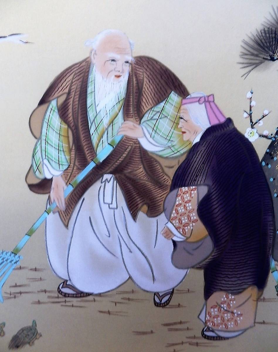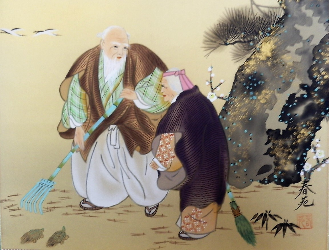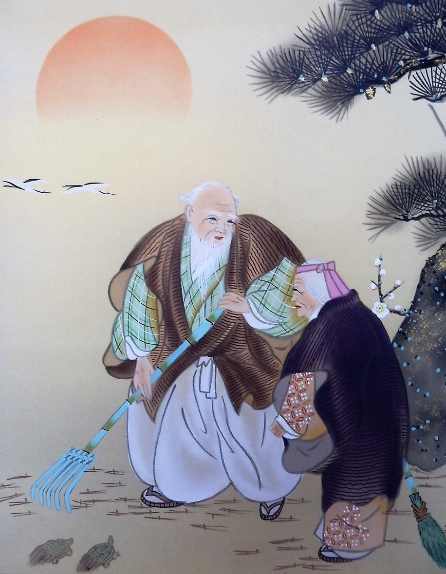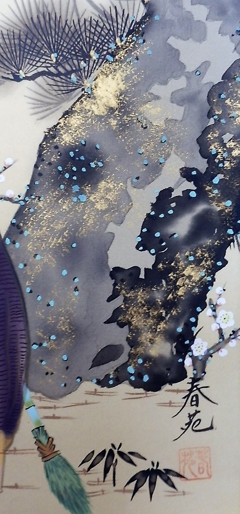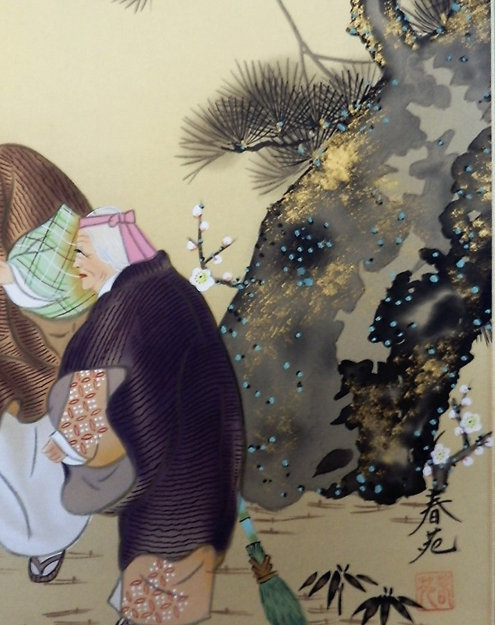 コメント:正月用祝儀掛の掛軸「高砂之図・彩色」です。横物で小さな床でもかけられます。