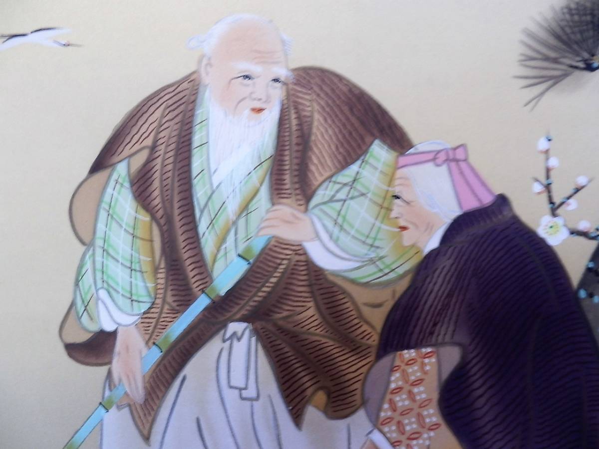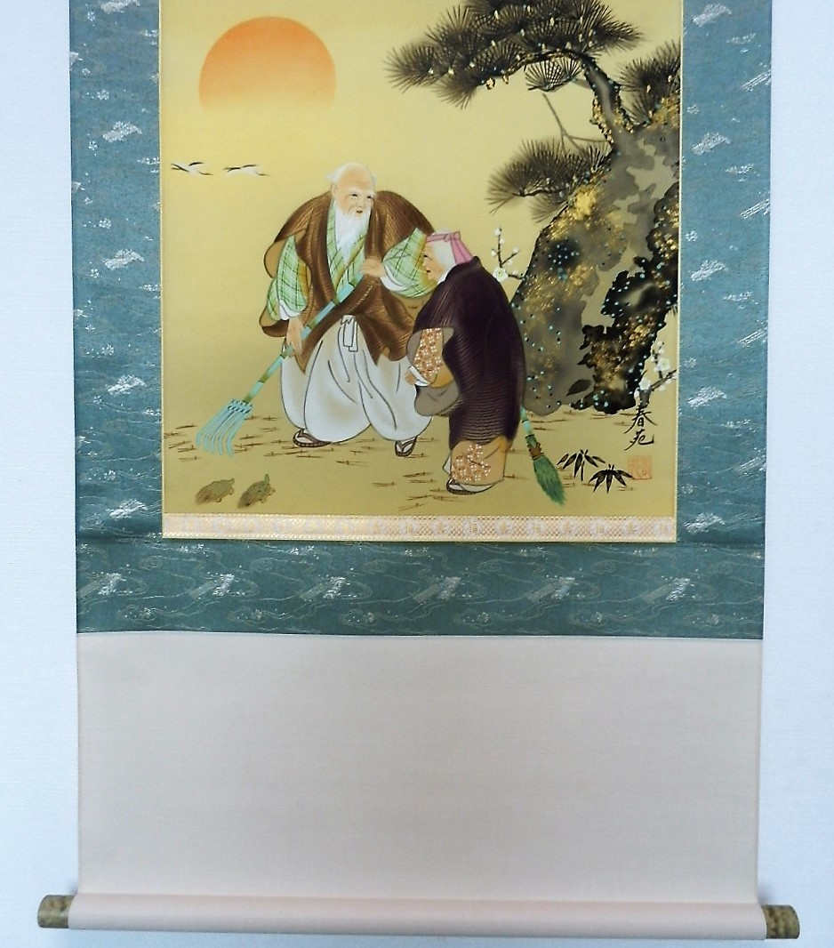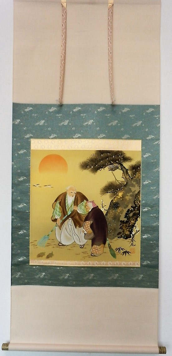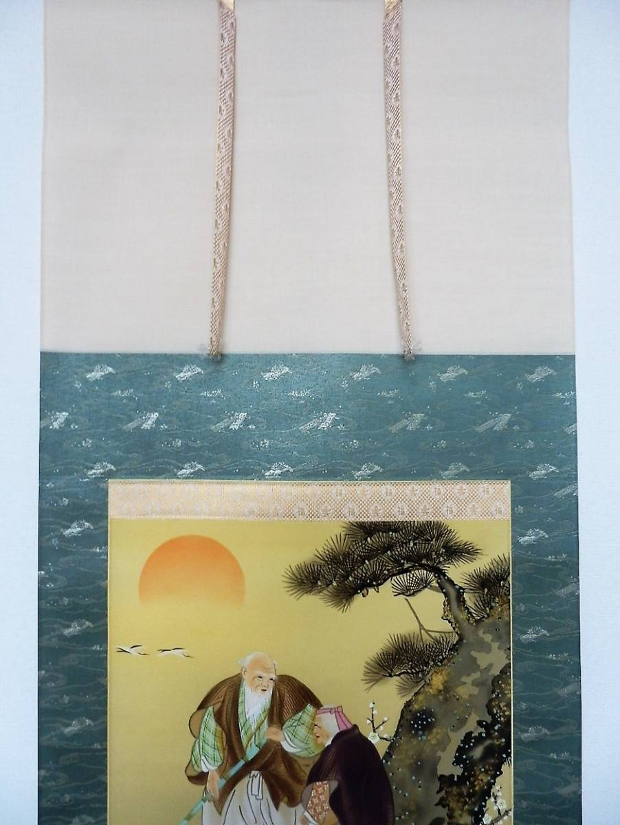 掛軸・尺五横・絹本、高砂之図(春苑筆)三段表装下がり風袋付 彩色の高砂之図です。婚礼・結納・祝儀・正月用祝掛 日本製