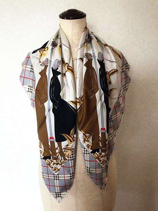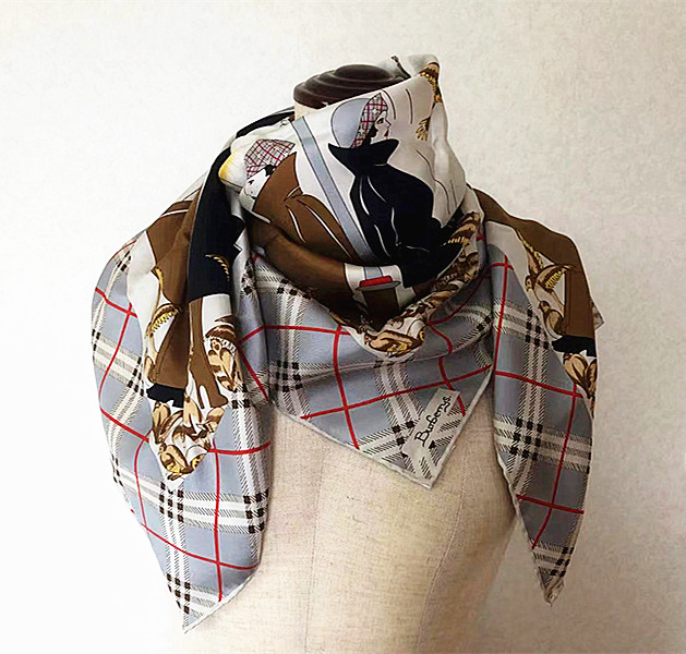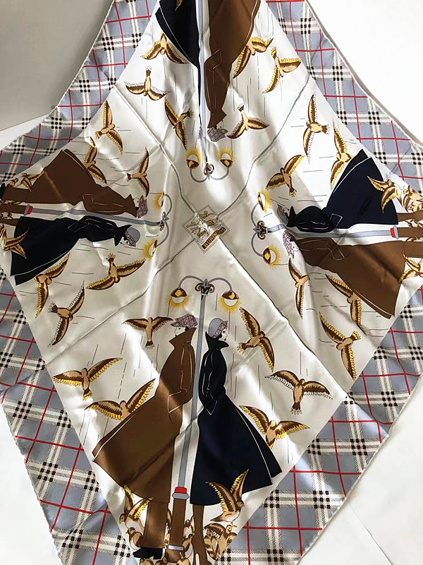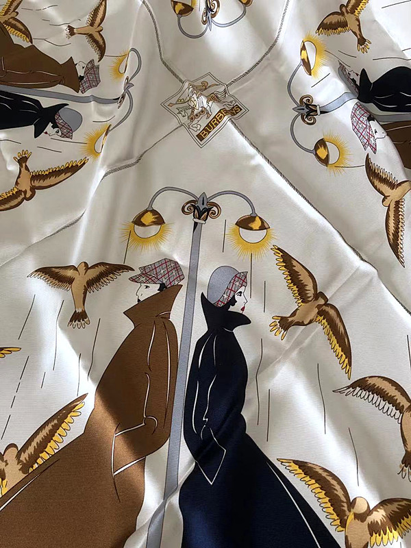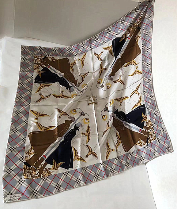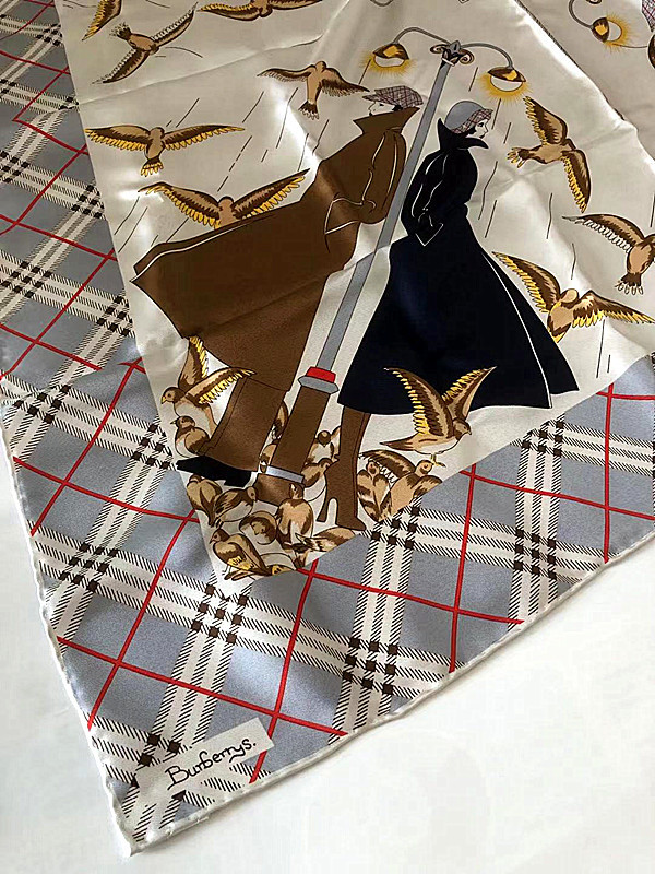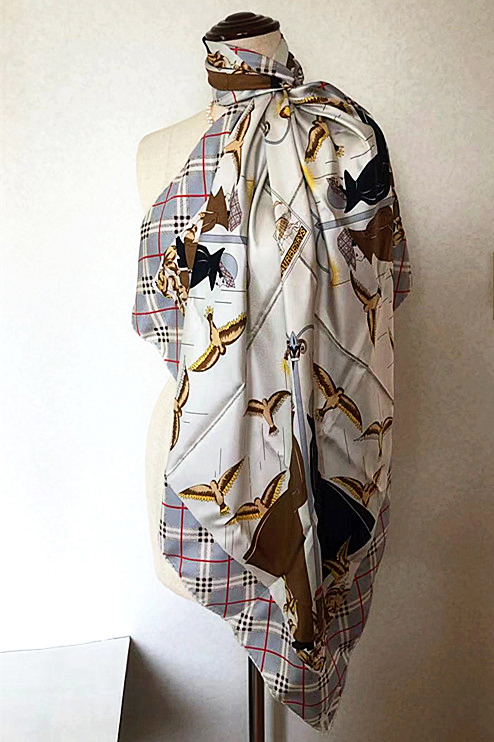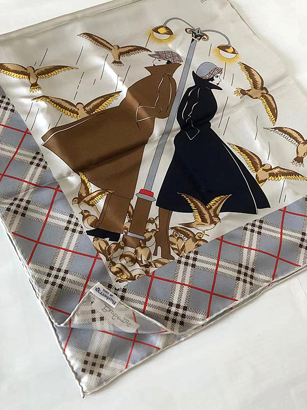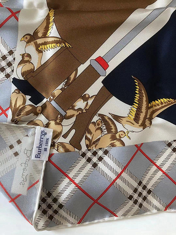 正規品鑑定済みBurberry バーバリーレア柄◆ビンテージ水色ノバチェック縁人物&鳥柄シルク大判スカーフ★87×88㎝