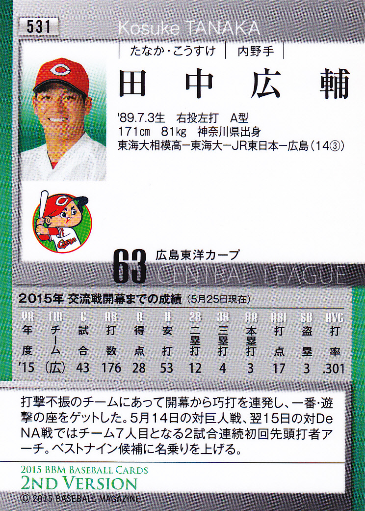 BBM2015ベースボールカード2nd 531 田中広輔 神奈川県 東海大相模 東海大学附属相模高校 東海大学 広島東洋カープ