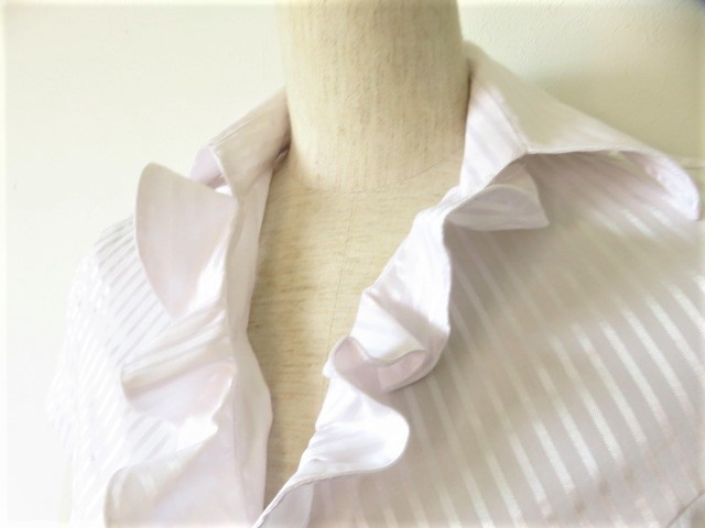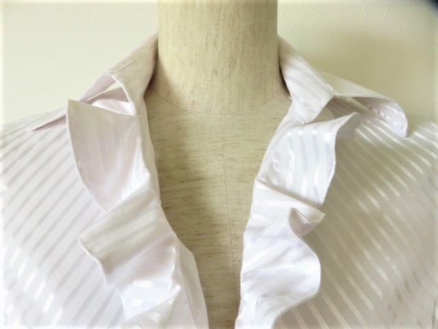 ■上質美品【NARACAMICIE】ナラカミーチェ高級光沢ギャザーフリルブラウス 光沢シルバーストライプシャツ【0】送料198円 w442