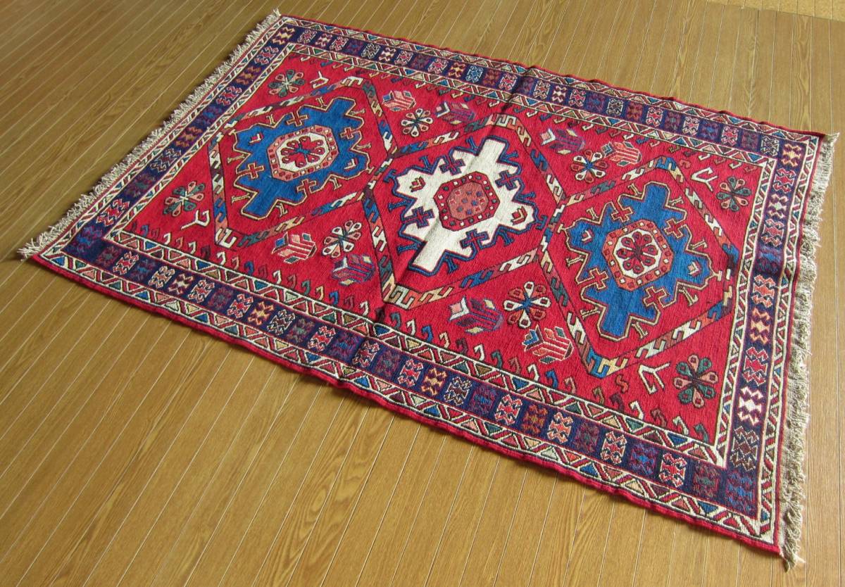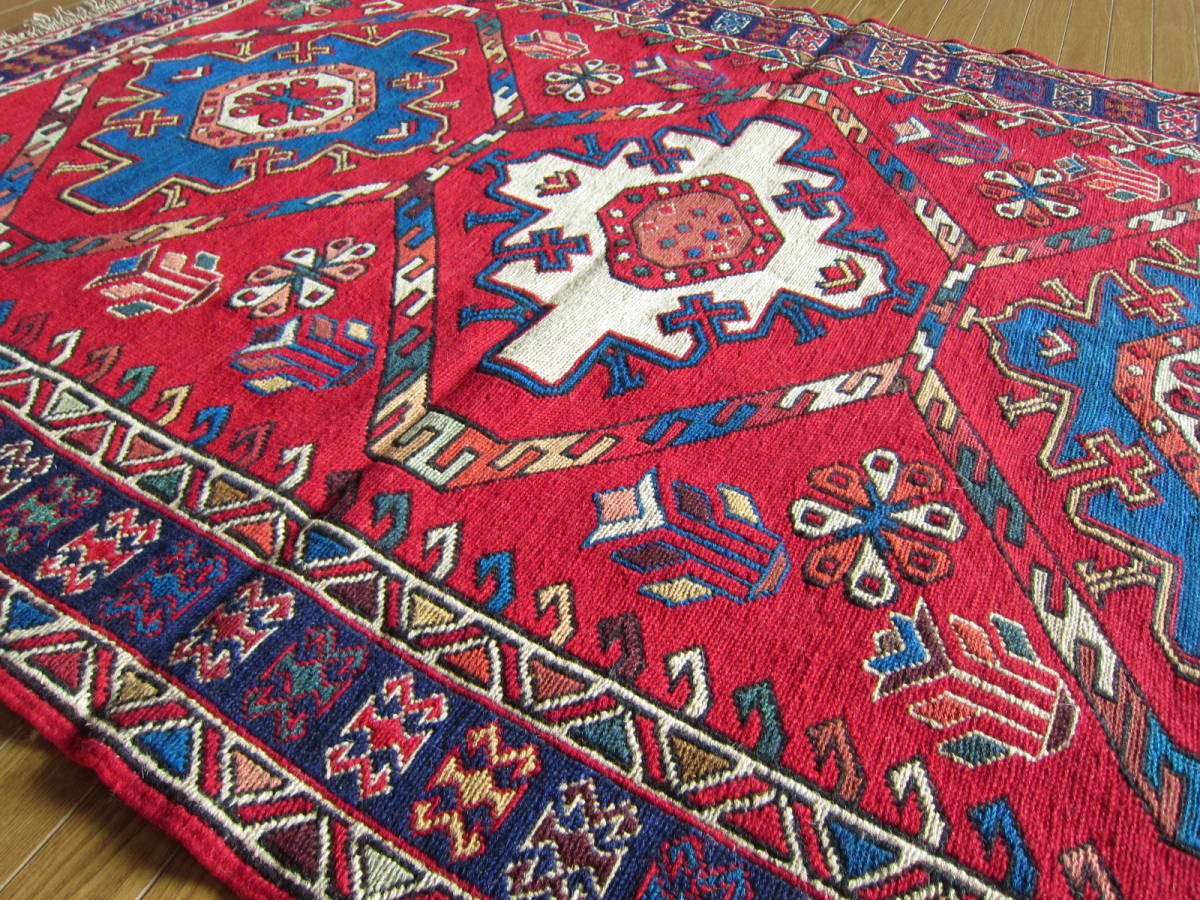 商品説明 | ★素材 : ウール・手織り・スマック織り ※スマック織りとは、イランのキリムの織り方の技法です。 土台の縦糸と横糸の上にもう一本横糸を絡めるように 巻き込んで織っていく高度なテクニックで、 刺繍のように細かな文様を描けることができます。 スマック織りは裏面に模様の糸を渡してあるので 片面使いのキリムになります。 ★サイズ : 約 150×108 cm (房を含まない長さです) ★産地 : イラン・アゼルバイジャン ★状態 : 新品 kxpgs342+ZIBACARPET絨毯 kxpgs342+ZIBACARPET取扱いペルシャ絨毯 FARSHEZIBA_KILIMキリム |