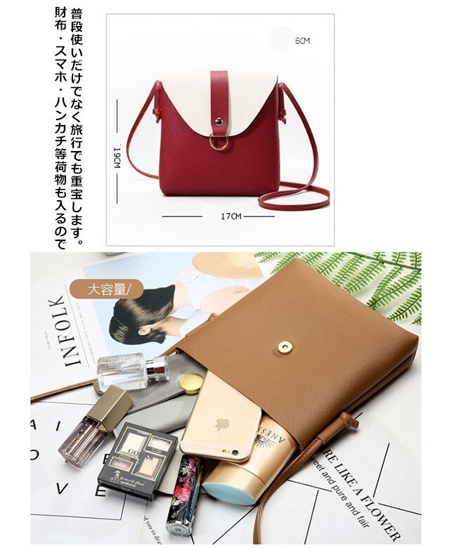 ランチタイムやコンビニ、お散歩など「ちょっとそこまで」のお出かけにピッタリ☆可愛いデザインだから、気軽に使ってとってもお洒落なんです?必要なものはしっかりと入る優れもの、身軽にお出かけが楽しめます手触りのいい、柔らかい触り心地の合皮で、シンプルなデザインに差し込み金具がアクセント!!ショルダーストラップは長さを調節することで、肩からかけも可能です。素材:PU重さ:250g生産地 :中国サイズ:約19cm×17cm×3cm