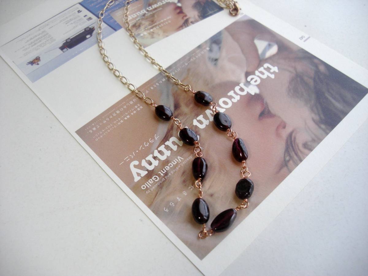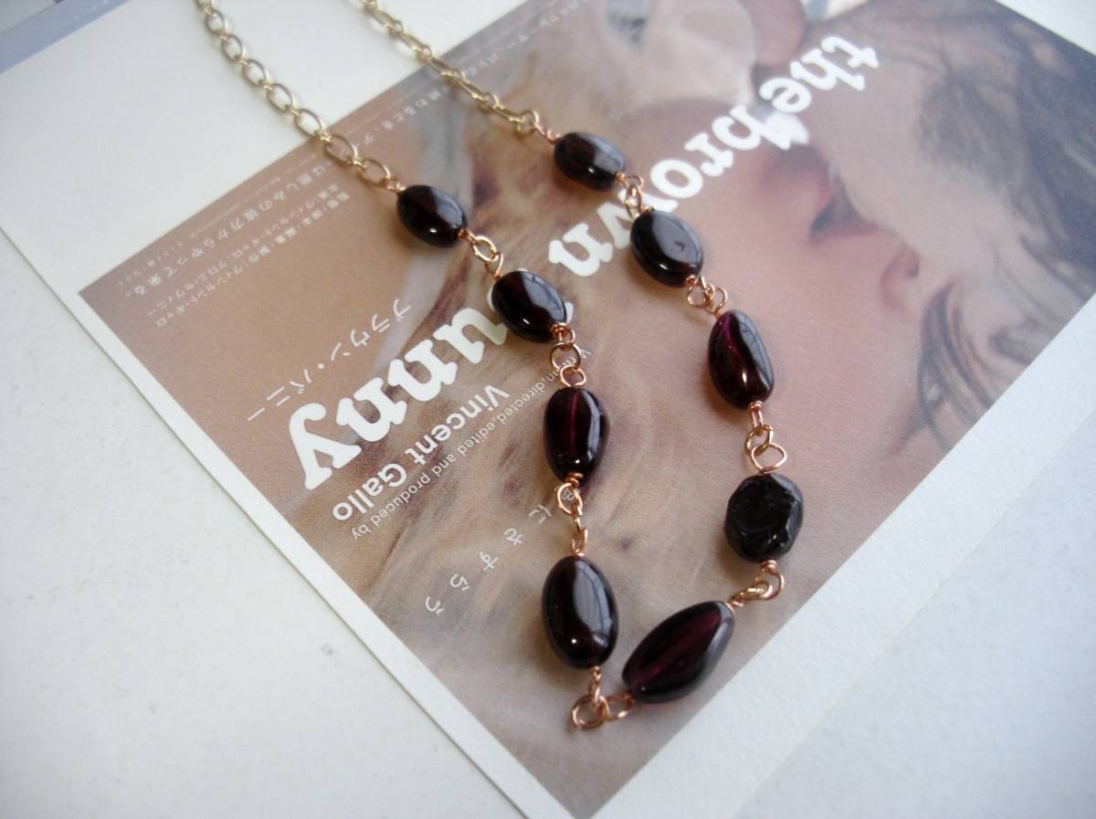 お揃いコーデ・・シリーズです♪ガーネット見本帖・・深い赤のガーネットのネックレスです♪オーバルのガーネットにピンクゴールドのチェーンを合わせて可憐な表情です♪11ミリ×7ミリ位のオーバルのガーネットを繋いだネックレスは全長70センチくらいで調節自由です♪ブレスレット にされても可愛いです♪ブレスレット、イヤリングも出品しています♪♪シンプルで飽きのこないいつまでも着けられるデザインを考えて作りました!ハン ドメイドをご理解頂いてノークレーム、ノーリター ンでお願いします