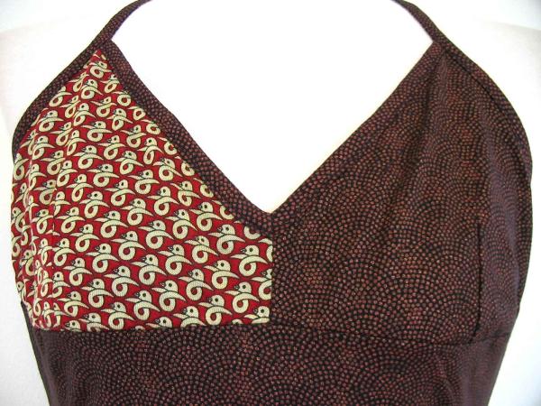 ポイントの左バストのレトロ風な鳥柄がキュート、全体は黒に赤茶と金色の点々の半円模様 のジャージー生地です。