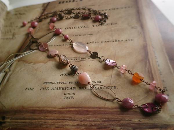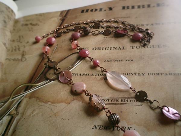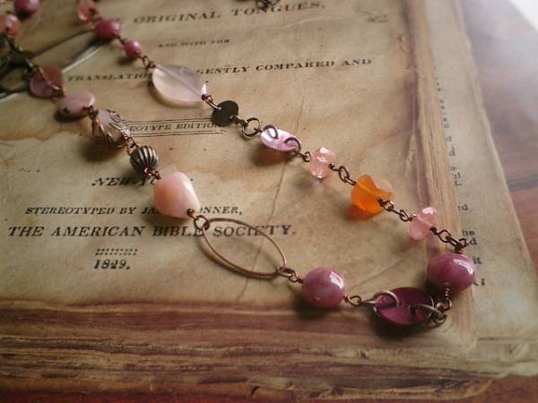 形のない夢を捉えて!シリーズです♪アンニュイなモーヴピンクを集めて可憐にまとめました♪ロードナイトは6ミリの丸玉や10ミリ、12ミリのコイン型です♪座金でおめかししたピンクオパールは15ミリ位のラフカット、カーネリアンは10ミリ位のラフカット、チェリークォーツは8×6ミリ位のボタンカット、ピンクカルセドニーは26×15ミリ位のマーキス、12ミリのワインレッドやモーヴピンクのシェルボタン、メタルチャームやデザインチェーンを合わせました♪シックなピンクでまとめてキュートに大人のロマンチックしています♪長さは全長83センチ位で調節自由です♪2連にされても可愛いです♪♪お揃いのブレスレットや同じシリーズも出品しています♪シンプルで飽きのこないいつまでも着けられるデザインを考えて作りました!ハンドメイドをご理解頂いてノークレーム、ノーリターンでお願いします