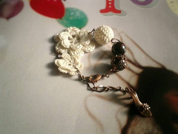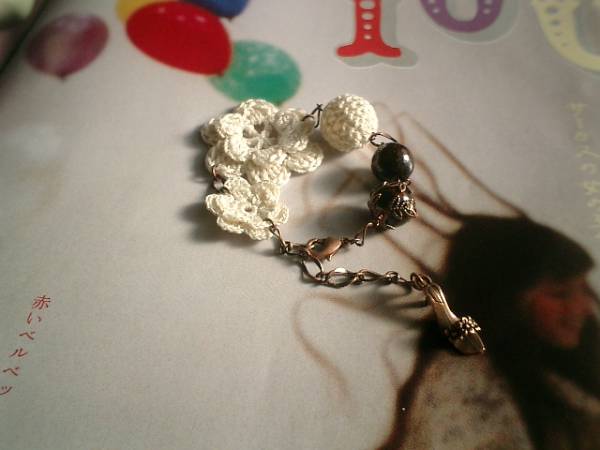 時の隙間シリーズです♪過去と未来の夢を探して・・♪シックなブラウンとオフホワイトでまとめたロマンチックなブレスレットです♪ブラウンは座金でおめかしした12ミリのウッドです♪オフホワイトの15ミリの編みボールや編みフラワーをあわせて可憐な表情です♪パリ(??)っぽいアンティークな雰囲気で作りました。長さは全長23センチ位で調節自由です♪お揃いのネックレスも出品しています♪シンプルで飽きのこないいつまでも着けられるデザインを考えて作りました!ハンドメイドをご理解頂いてノークレーム、ノーリターンでお願いします