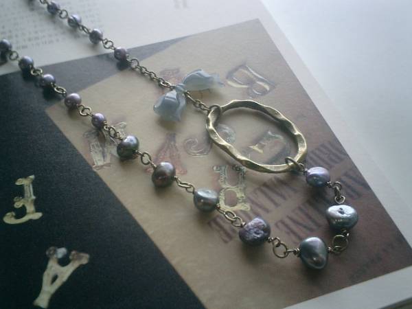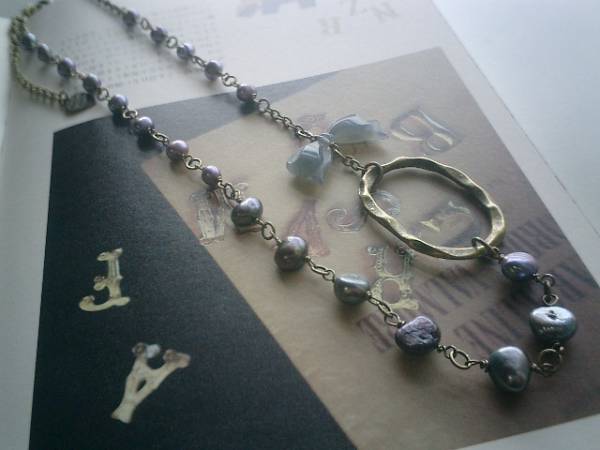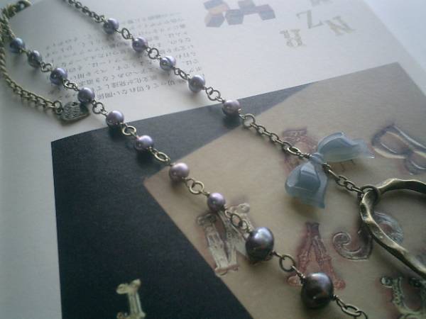 女の子チック・・シリーズです♪グレーのパールとリボンのネックレスです♪シックなグレーパープルの淡水パールとグレーのドイツビーズのリボンが可憐な表情です♪淡水パールは5ミリから10ミリ位までのポテトやバロックなどの大きさ違い、デザイン違いです♪ドイツビーズのリボンは30×15ミリ位です♪デザインリングを合わせて大人のロマンチックしています♪長さは65センチ位で調節自由です♪お揃いのブレスレットも出品しています♪シンプルで飽きのこないいつまでも着けられるデザインを考えて作りました!ハンドメイドをご理解頂いてノークレーム、ノーリターンでお願いします