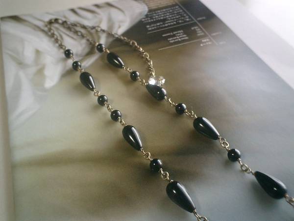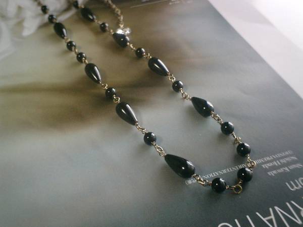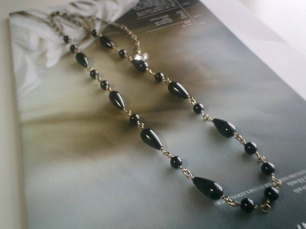 ミニシアターの余韻・・シリーズです♪赤い靴の少女・・シックなオニキスのネックレスです♪大人仕様のデザインです♪6ミリの丸玉、18×8ミリのドロップのオニキスにアンティークチェーンを合わせて可憐な表情です♪長さは全長65センチ位で調節自由です♪チョーカー風にされてもブレスにされても素敵です♪♪お揃いのネックレスやブレスレットやピアスも出品しています♪♪シンプルで飽きのこないいつまでも着けられるデザインを考えて作りました!ハンドメイドをご理解頂いてノークレーム、ノーリターンでお願いします