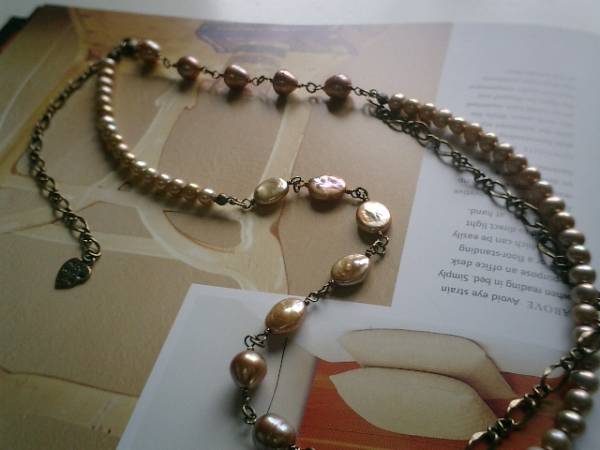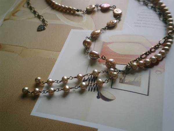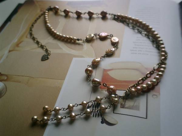 巴里・ミッシェルシリーズです♪ロマンチックを見つけて!シックなシャンパンゴールドの淡水パールのネックレスです!さりげなく華やかな素材を合わせてアンティークな雰囲気です♪巴里の裏町をイメージして作りました♪シャンパンゴールドの淡水パールは5ミリの丸玉と9ミリ位のバロックと8×12ミリ位のオーバルです♪遊びの入ったキュートなデザインです♪落ち着いたアンティークチェーンを合わせてさりげなく華やかです♪♪長さは52センチ+アジャスター10センチで最長62センチ位です♪トップは7センチ位です♪お揃いのブレスレットも出品しています♪シンプルで飽きのこないいつまでも着けられるデザインを考えて作りました!ハンドメイドをご理解頂いてノークレーム、ノーリターンでお願いします