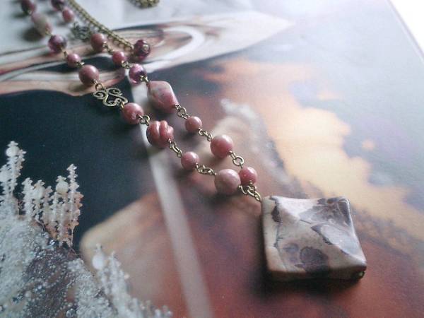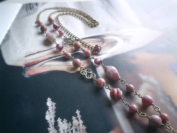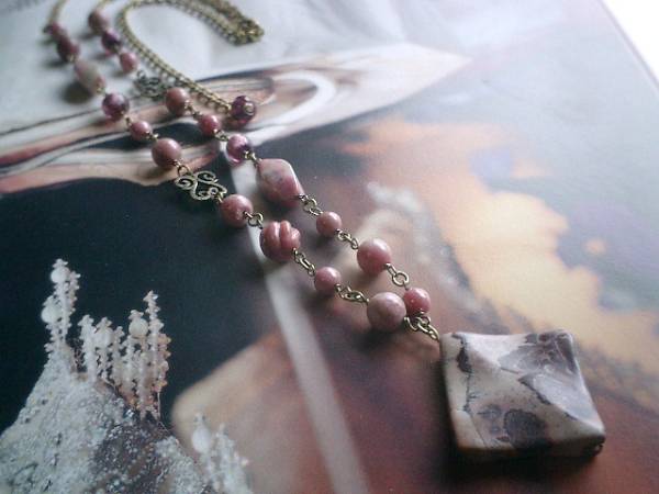 ロマンチズム紀行・・シリーズです♪アンニュイなロードナイトのネックレスです♪モーヴピンクのロードナイトは6ミリ、8ミリの丸玉や10ミリのSラインや17×8ミリ位のスクリューカットなどのデザイン違いです♪ダークパープルのベネチアビーズやデザインチャームを合わせました♪トップの薔薇の模様の25ミリのピカソジャスパーがニューヨークモダンな表情です♪長さは64センチ+アジャスター18センチで最長82センチ位です♪間に丸カンがありますので短く着けてもいただけます♪お揃いのブレスレットも出品しています。ハンドメイドをご理解頂いてノークレーム、ノーリターンでお願いします