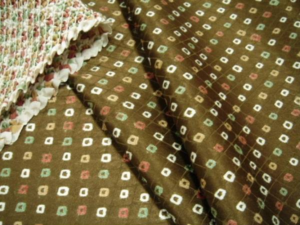 挿し色を彩色後、疋田の鹿の子絞りを熟練した職人が丹精込め手間隙を掛け手作業にて絞り上げ、その後「茶褐色」(少しスモークかかった濃茶色)で無地染めし丁寧に解いた高級小紋着尺です。