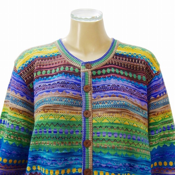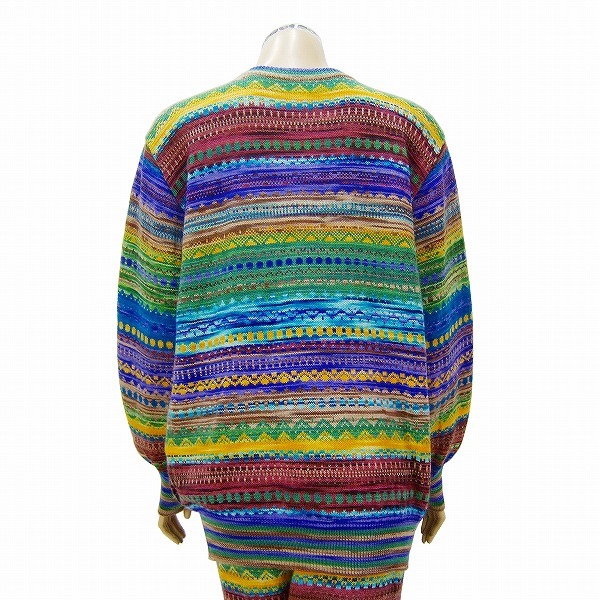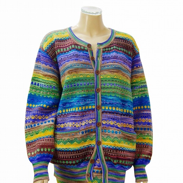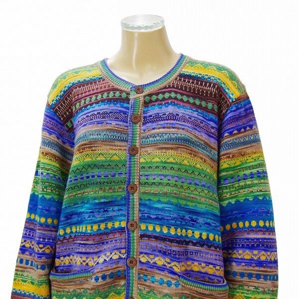 **・゜手づくりの限界をきわめた森岡幸子さんのニットは一本の糸を紡ぎ染めた糸で極上の編みにて芸術作品が生まれます。素材、染色、縮み込みまで切磋した創造豊かで緻密な手作業でおこなわれるため唯一無二の世界に一枚しかない最高峰ハンドメイドニットです。綺麗な幾何学入りの美しいブルー&イエロー系入りの極彩ミックスカラーニットです。たっぷりシルエット一重カーディガン×ウエストゴム仕様のゆったりパンツ(膝下位迄裏地付き)定番ロゴボタン留めの男女兼用にてお召頂ける希少サイズの豪華ウールニットセットアップの最高級パンツスーツです。.。*:.。(晩秋初春、冬向き)