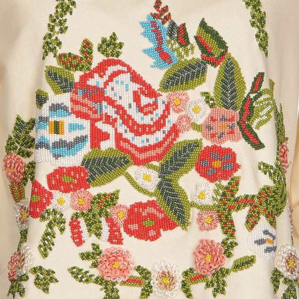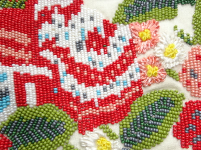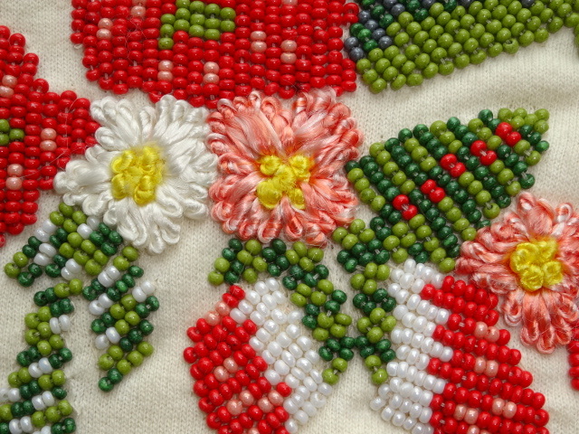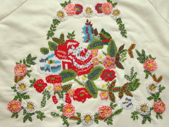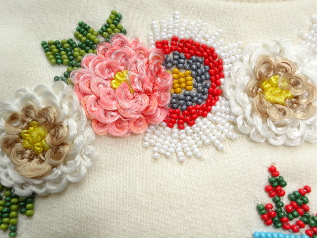 ビーズと刺繍で、全面にお花の模様が丁寧に施されています。 とても繊細なデザインです。たくさんのカラーのビーズで、綺麗なモチーフを表現しています。