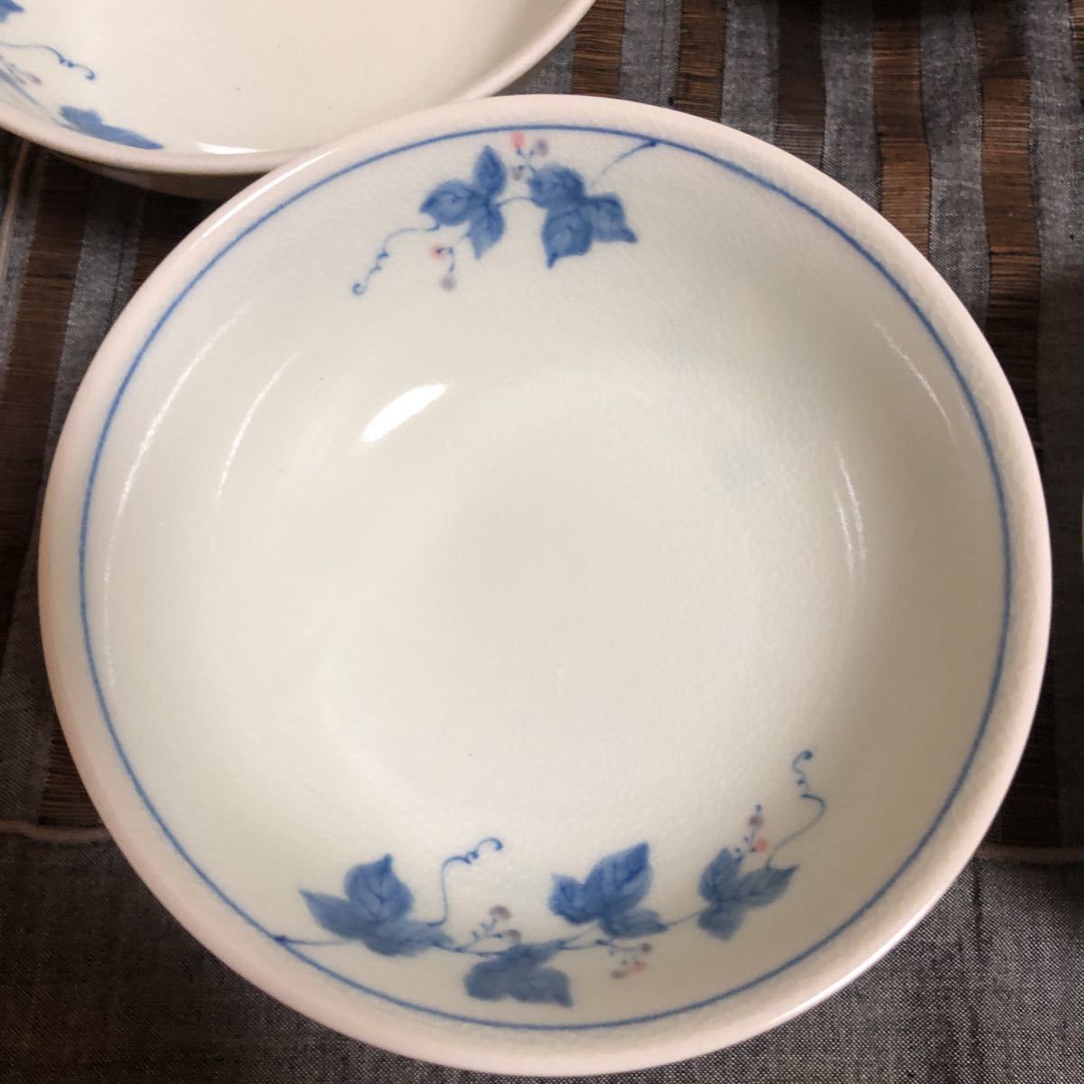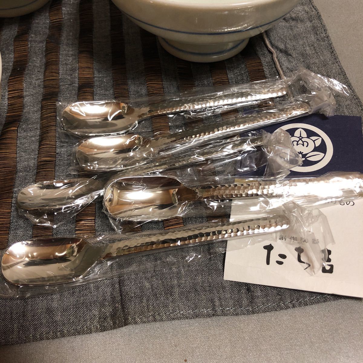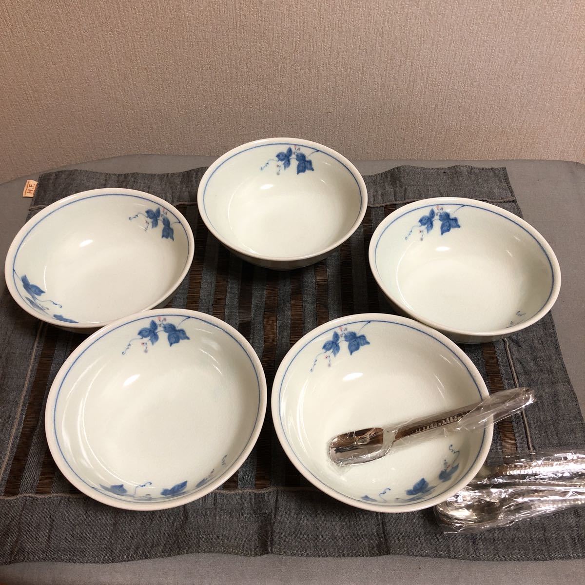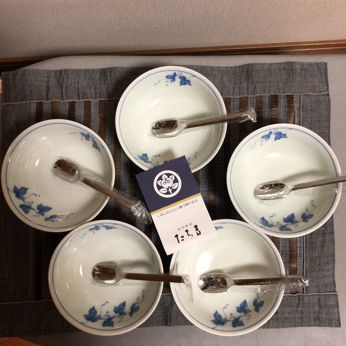 未使用!たち吉 貫入 (ヒビ入) 陶器 5枚 セット 白地に青の花柄小鉢 スプーン5本付き