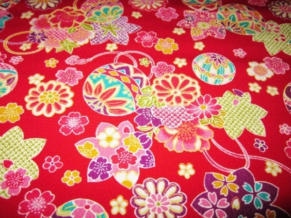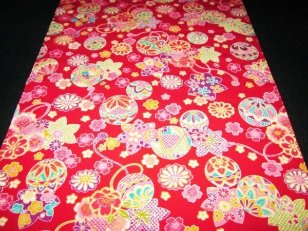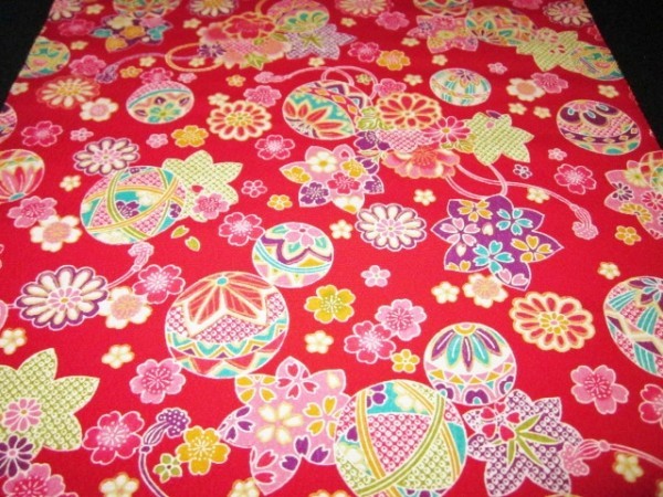 | 【京わぎれ】正絹 友禅染はぎれ てまりと花柄 赤色地 変わり無地ちりめん生地 1.95m① | ||||