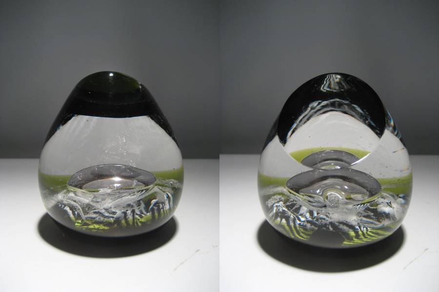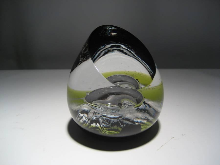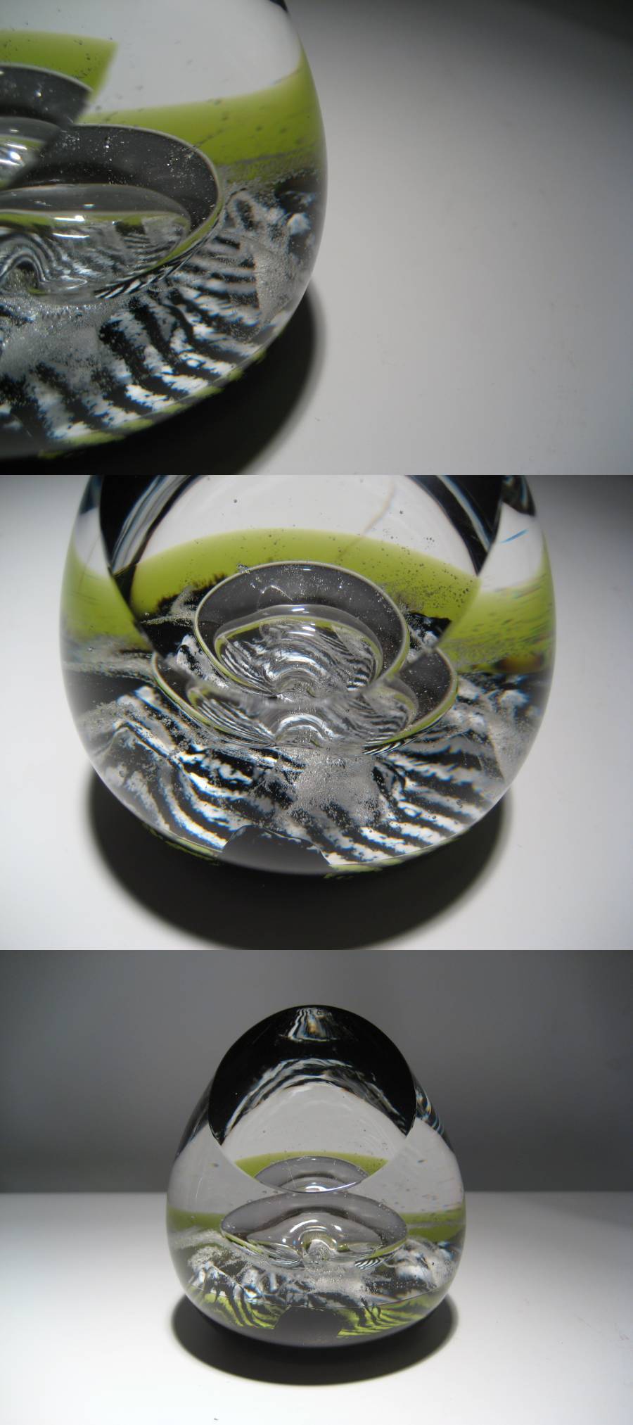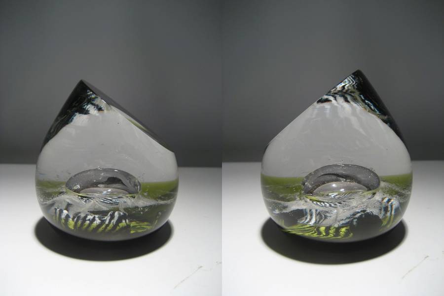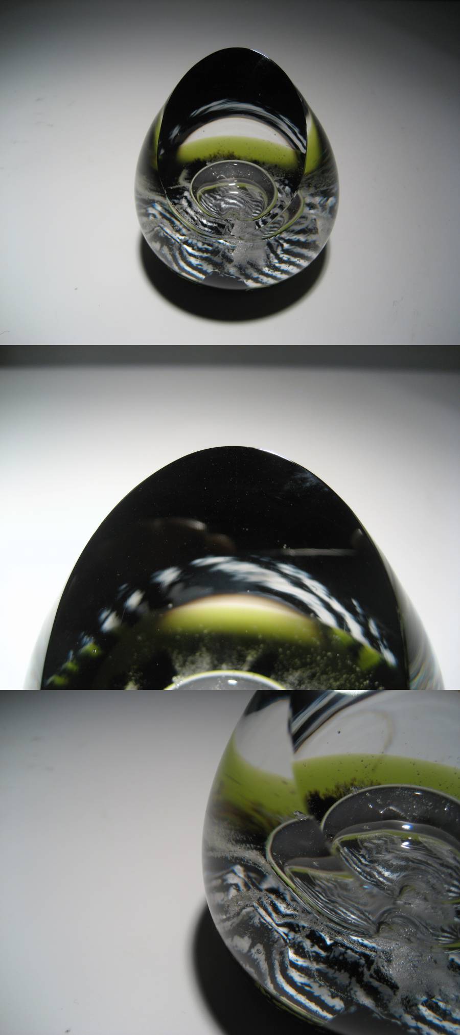 Domino (ドミノ)という名の作品。片面を斜めにそぎ落とした卵型のフォルムの中央に封じ込められた大き目の気泡、その下に広がる白黒のゼブラ柄、底面のモスグリーンの色、それらが織りなす幻想的な景色が美しい1品。作品名とデザインの関連は不詳ですが、色合い、デザインともにケイスネスらしい有機的なナチュラルさと幻想的な印象を兼ね備えた良品だと思います。