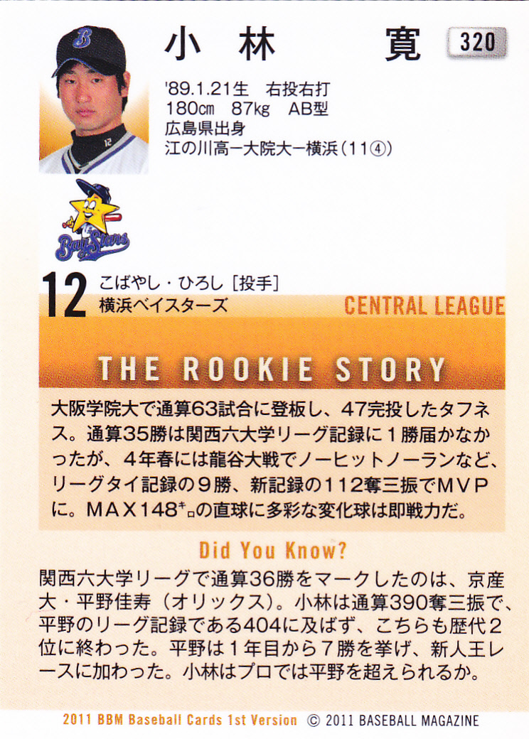 2011BBMベースボールカード1st 320 小林寛 横浜ベイスターズ 広島県 江の川高校 大阪学院大学 ルーキー