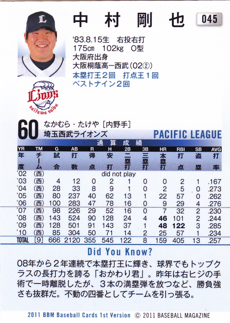 2011BBMベースボールカード1st 045 中村剛也 西武ライオンズ 大阪府 大阪桐蔭高校 本塁打王 打点王 ベストナイン