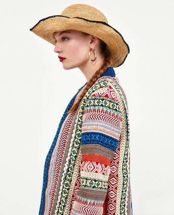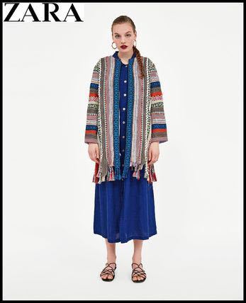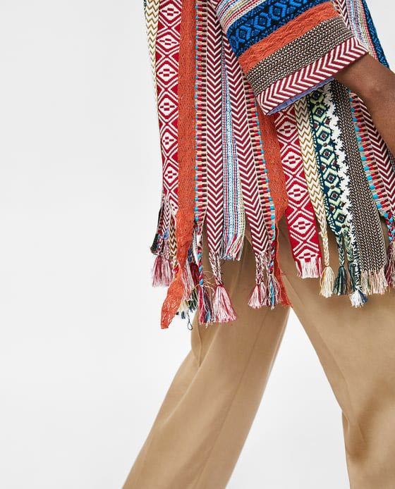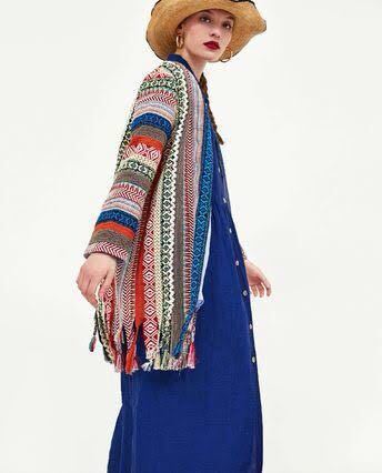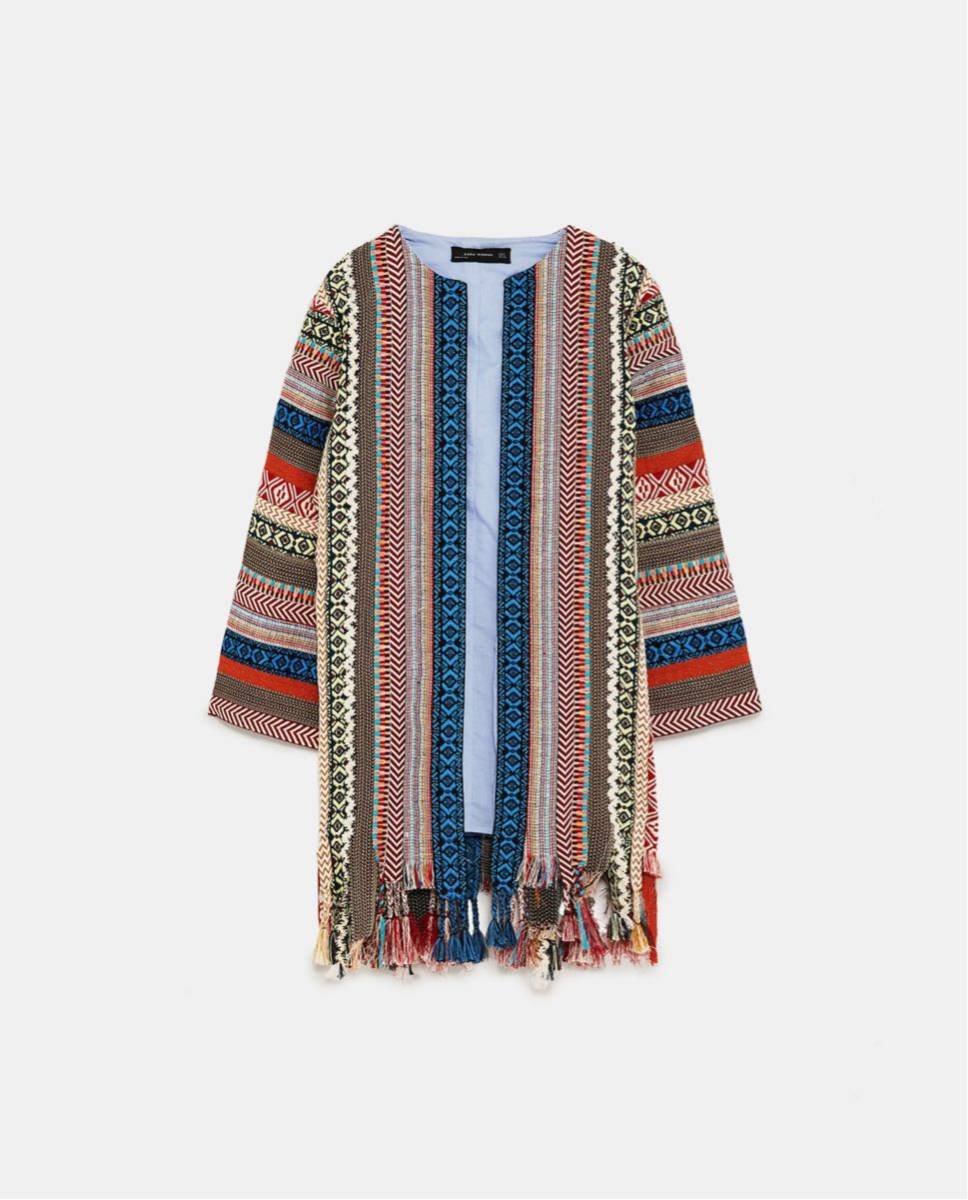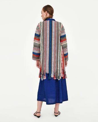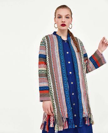 様々なエスニック柄を編みこんだ生地を組み合わせたエキゾチックなニットコート。フリンジ加工や鮮明な青いトリムがエレガント。美しく高級感もあり、ベースがクリーム系カラーなので上品にまとまります。