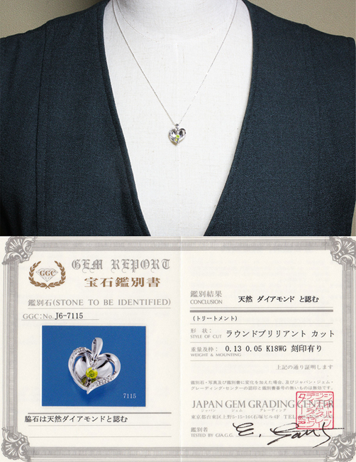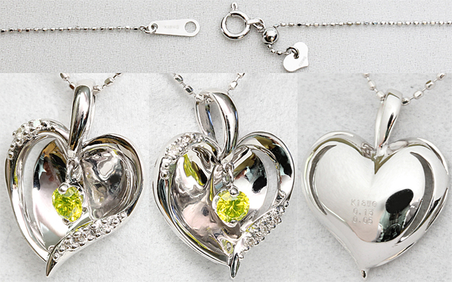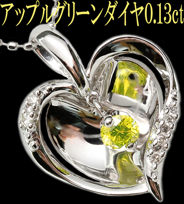 アップルグリーン☆ダイヤ 0.13ct+0.05ct K18WG ペンダントネックレス ハート りんご♪鑑別付・送料無料 | ||