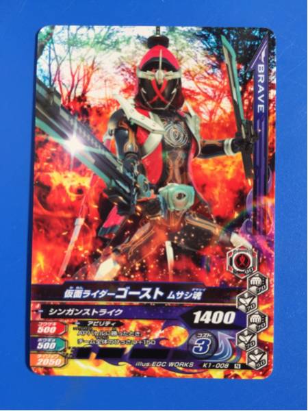 仮面ライダー、ガンバライジング・第K1弾からNo.008《仮面ライダーゴースト・ムサシ魂》の登場です。発送は、普通郵便を利用します。(特にご希望のない場合)おとりまとめも可能ですが、送料に変動が出ますこと予めご了承ください。他にも多数出品中です。まとめてこの機会にいかがでしょうか?ご質問お待ちしております。