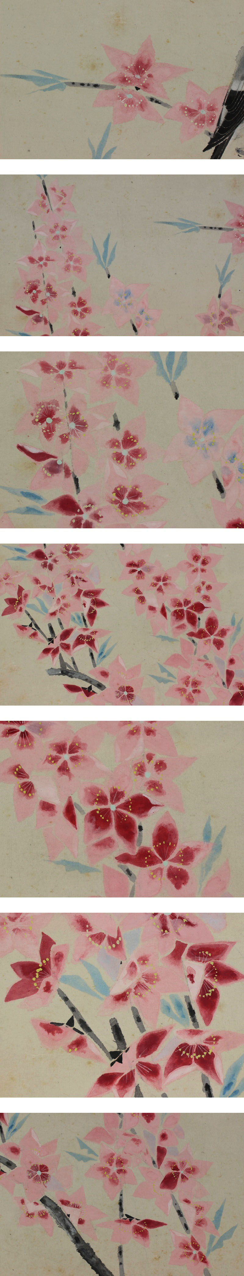 西山英雄 にしやま-ひでお(1911-1989) 昭和時代の日本画家。 明治44年5月7日生まれ。叔父西山翠嶂(すいしょう)に師事,青甲社にはいる。昭和9年「港」が帝展特選。33年日展で「裏磐梯(ばんだい)」が文部大臣賞,36年「天壇」が芸術院賞。山岳画家として知られる。55年芸術院会員。平成元年1月21日死去。77歳。京都出身。京都市立絵画専門学校(現京都市立芸大)卒。 本紙は、ヤケ、全体にシミ、汚れがあります。 表装は、ヤケ、シミ、汚れ、シワがあります。 【サイズ】 作品 横約51.5cm×縦約44.5cm 表装 横約65.5cm×縦約132cm |