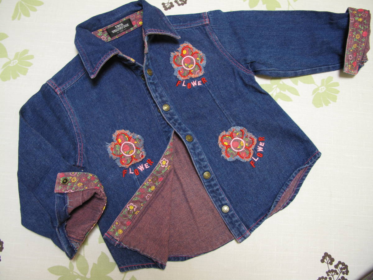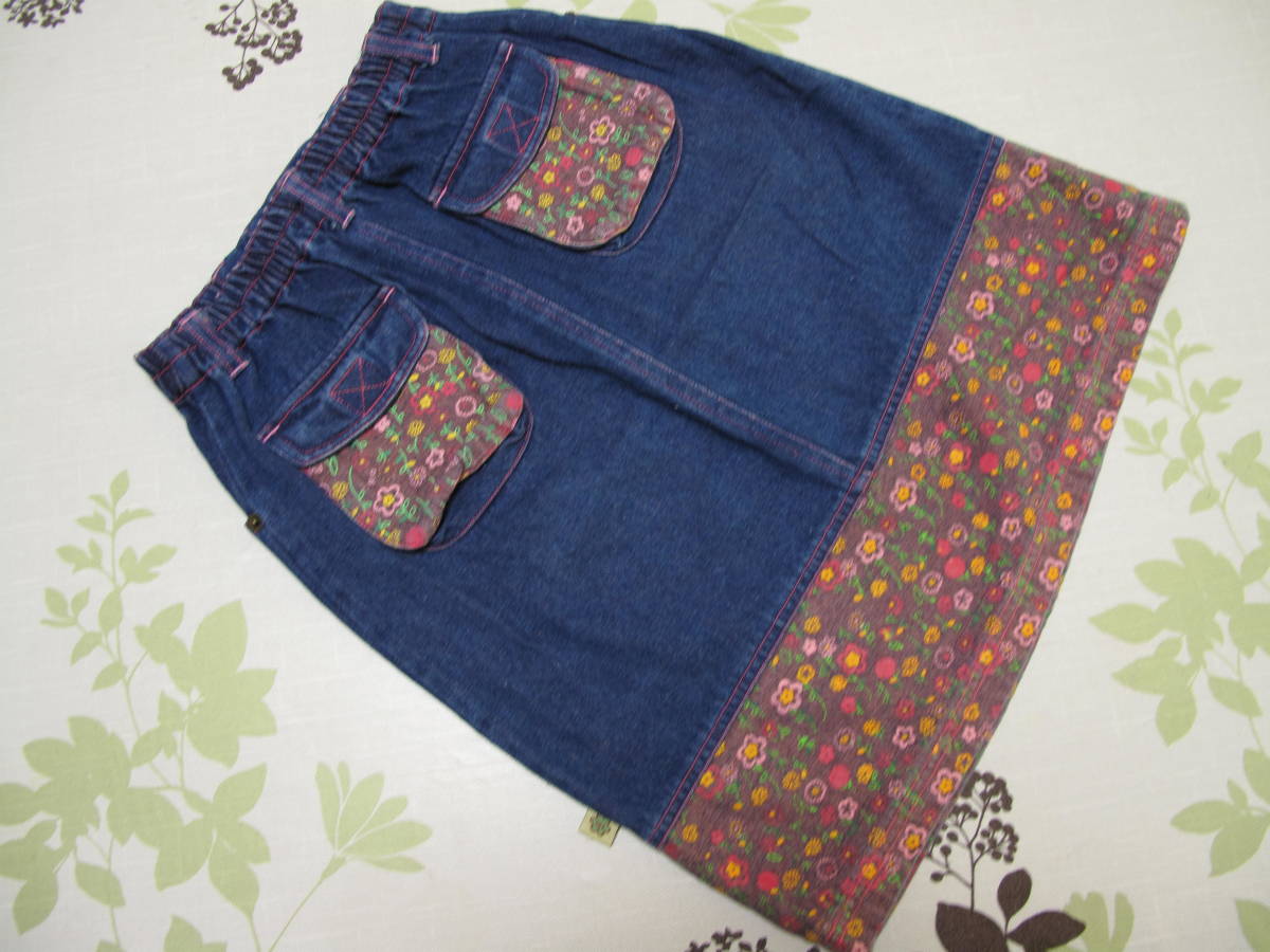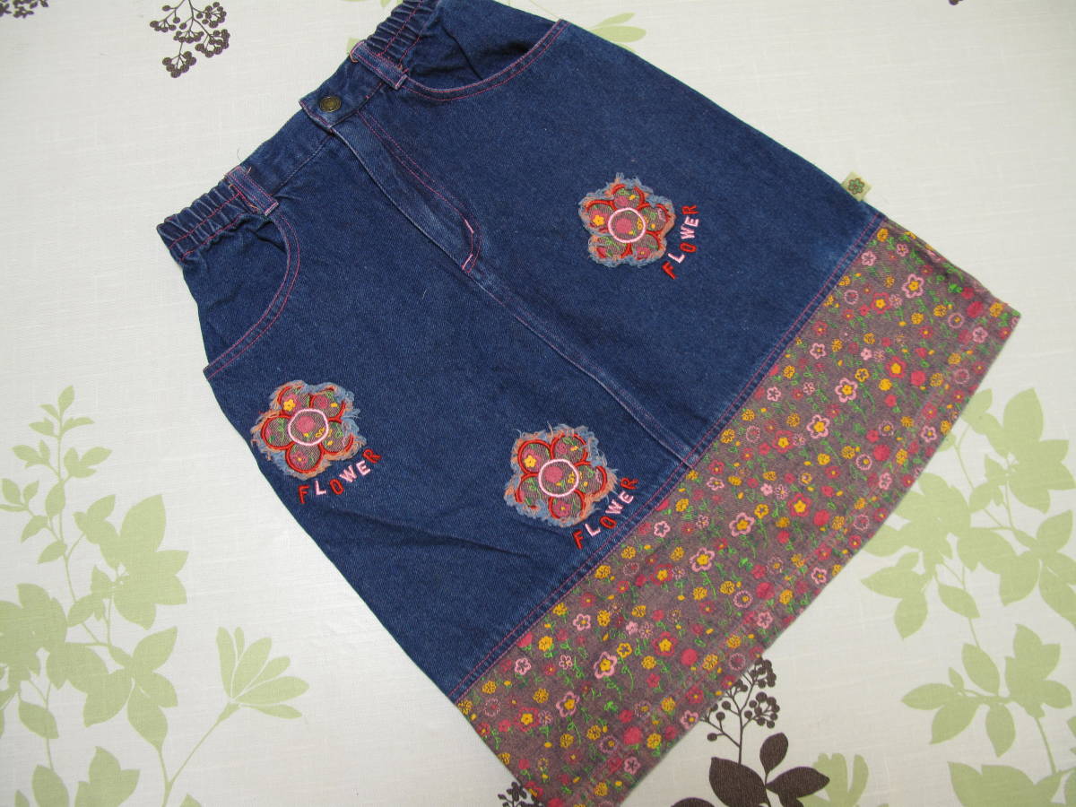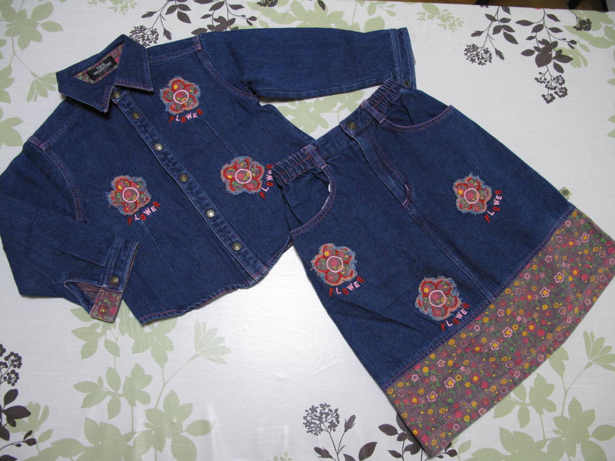 美品 120 2点セット 女の子 お花 パッチワーク 刺繍 デニム シャツ スカート 紺
