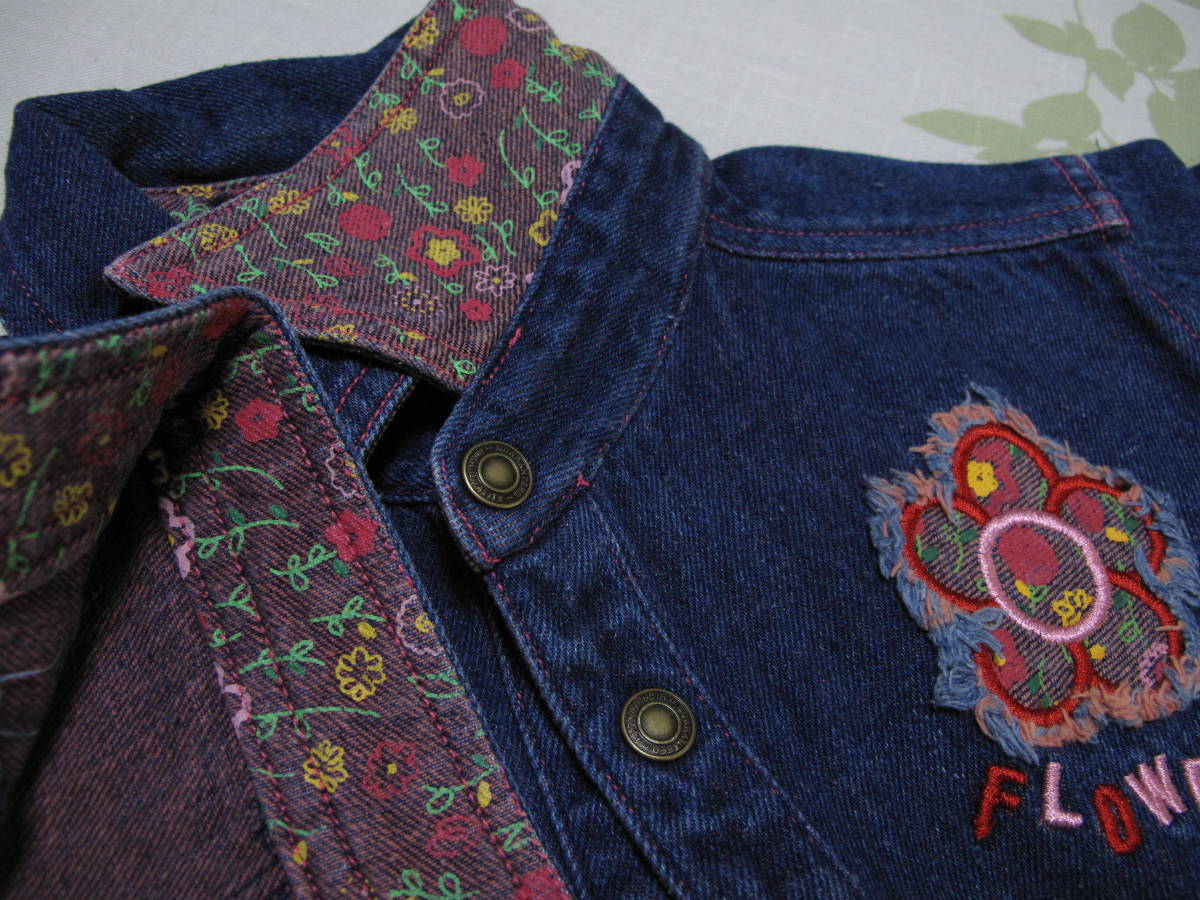お花のパッチワークや刺繍や襟の裏、袖の裏、スカートの裾、後ろポケットのお花のプリントされた生地、などとても可愛いシャツとスカートです。
