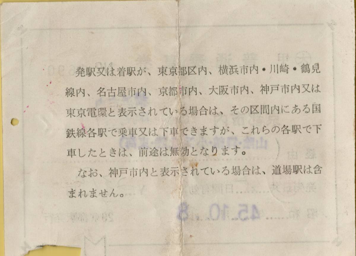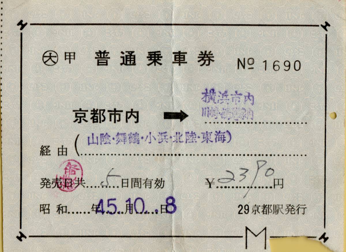◎ 軟券 【 普通乗車券 】 京都市内 → 横浜市内・川崎・鶴見線内