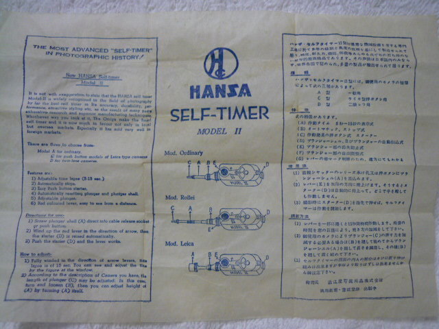 60年以上前のカメラ用セルフタイマーです、ハンザ モデルⅡとなります、可動品です、精度に関しては分かりません、プラスチックのケースに割れと穴が有ります、本体は古い物ですが目立つ傷も無く綺麗な状態です、それぞれ画像にてご確認下さい、当時の説明書が付いています、古い物ですので細かい事が気になる方は入札をお控え下さい。