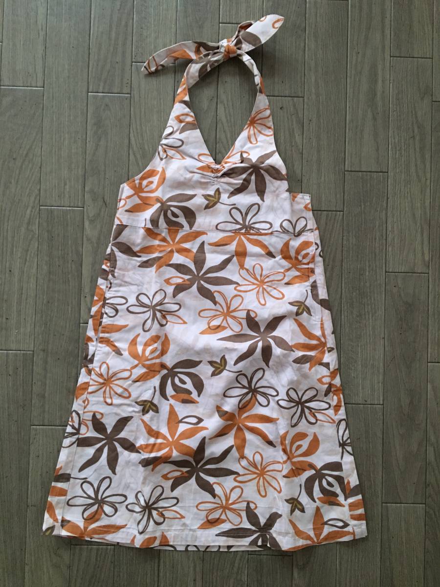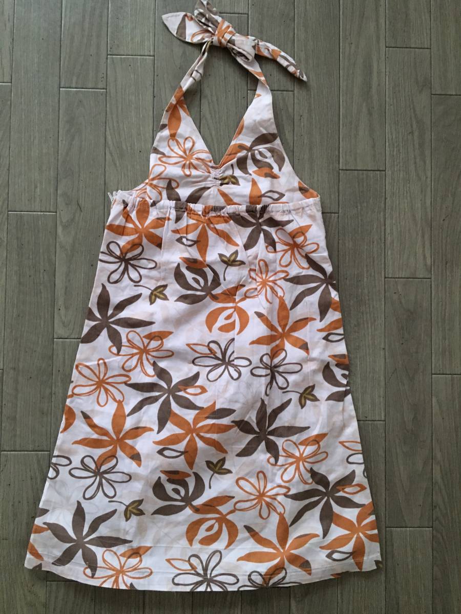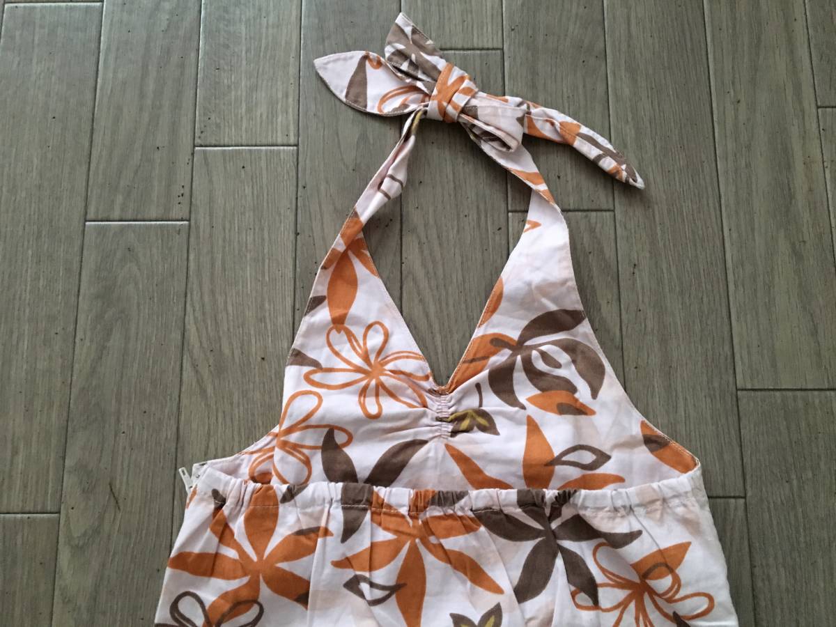胸元で切り返しになっているお花柄のボルターネックワンピで、アイボリー地にブラウンとオレンジの落ち着いた合わせやすいカラーです。
