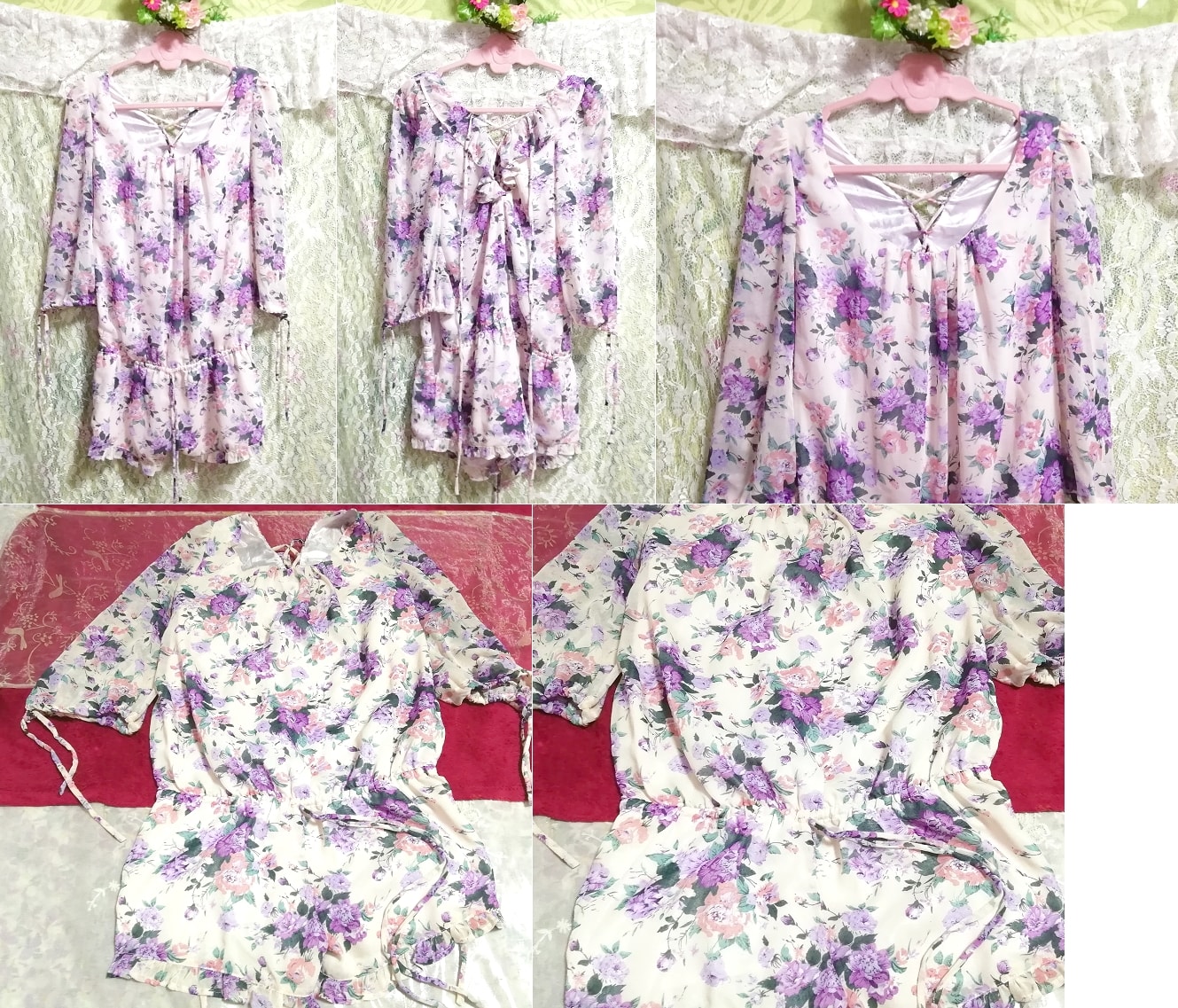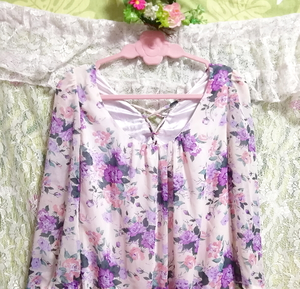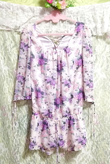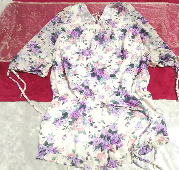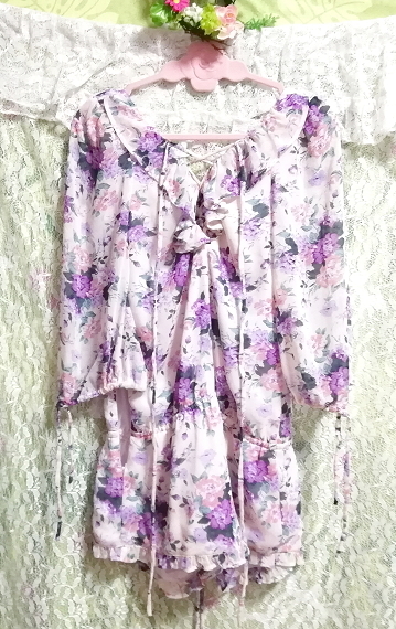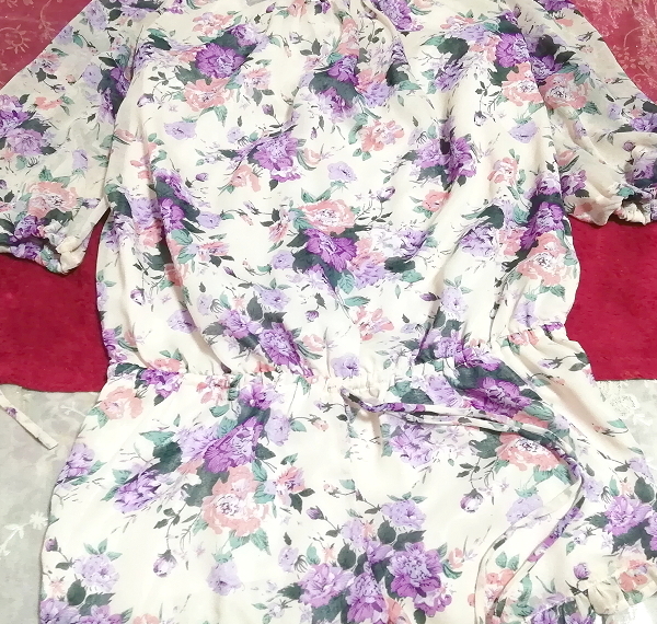 白紫花柄シフォンネグリジェキュロットワンピース White purple flower pattern chiffon negligee currot dress
