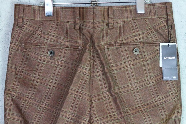 新品アルチザン上質リネングレンチェック春夏スラックスS茶麻絹 定価2.8万円/ARTISAN2