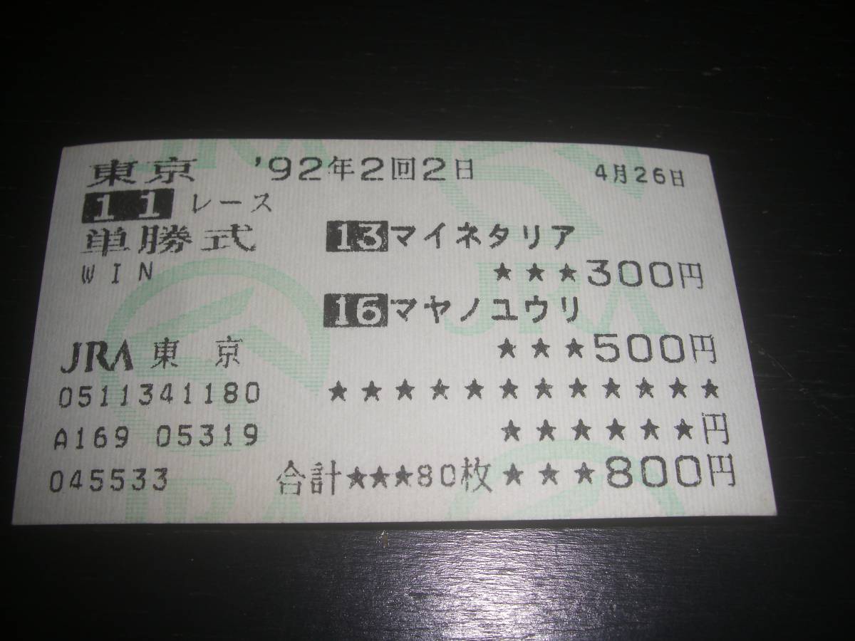| 1992年 スイートピーS はずれ単勝馬券 『 マイネタリア / マヤノユウリ 』 現地 です。 |