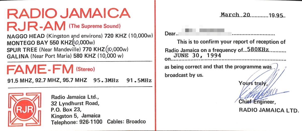 【商品名】・・・RADIO JAMAICA(★ラジオ・ジャマイカ)のベリカード。 【コメント】・・・中波とFM放送の為、日本での受信は困難です! 【国名・地名】・・・ジャマイカ★首都 キングストン。 【受信データ】・・・1994年6月30日・MW580KHZを受信。 【記載事項】・・・受信データ・受信者の氏名が記載。 【状態】・・・シワ、汚れ、シミ、焼け、色あせ等があります。 ■カードの状態は★画像を参考に判断して下さい。 ■当方、1枚のみ所有していますので即決で落札者様のコレクションになります! ■この機会にぜひこのベリカードを貴方のBCLコレクションに加えて下さい! | |