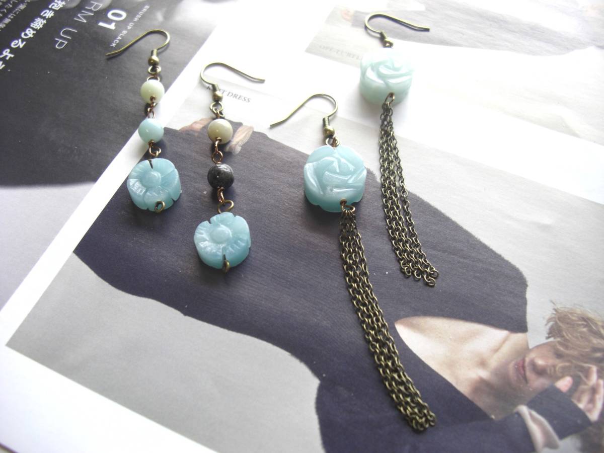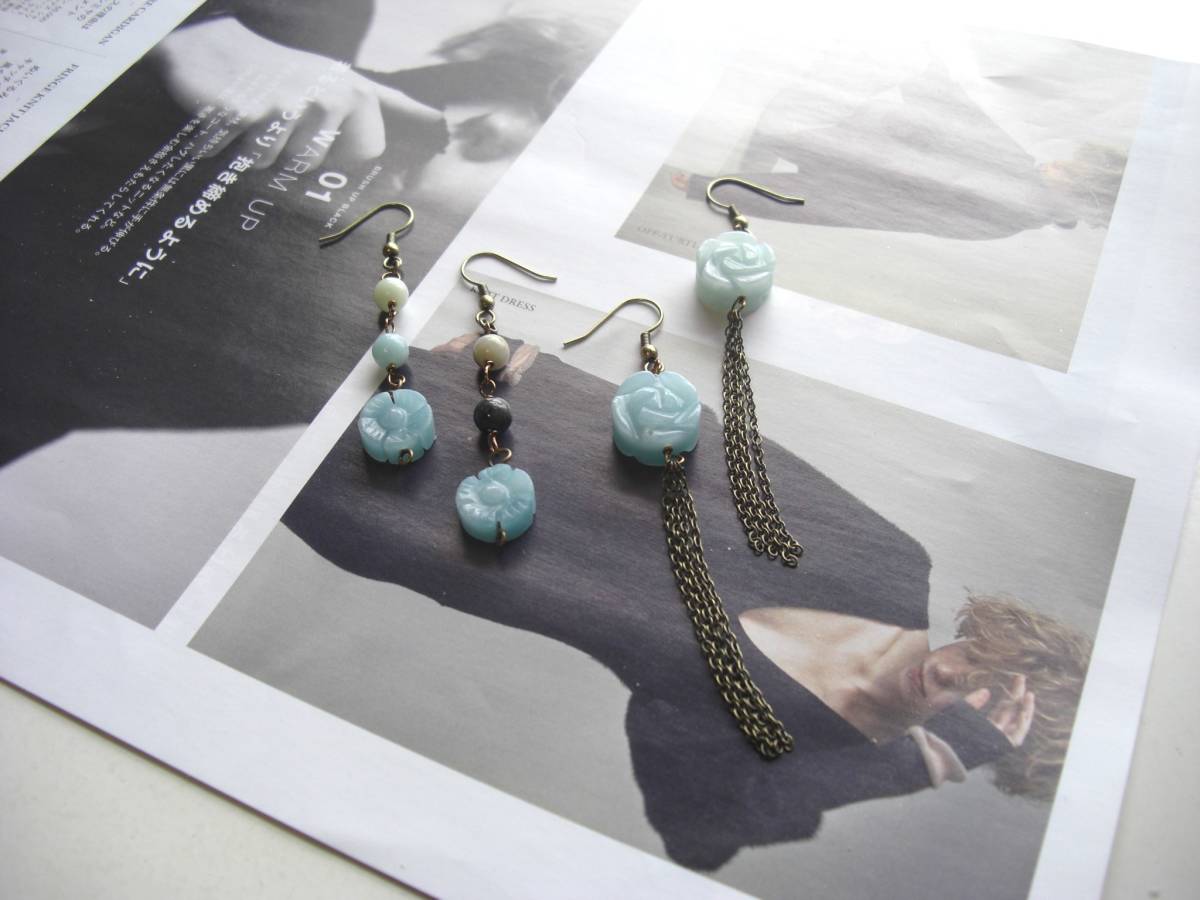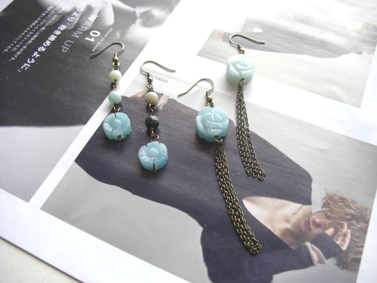 モンローの夢・・シリーズです♪水色の薔薇を繋いで・・ロマンチックなアマゾナイトのピアスです♪デザイン違いのペア2組セットです♪色々な組み合わせで楽しんでいただけます♪6ミリの丸玉、10ミリ、14ミリの 両面薔薇のアマゾナイトに華奢なチェーンを合わせました♪長さは左側のピアスが全長6・5センチ、右側のピアスが全長9・5センチ位です♪イヤリングにも変更出来ます♪お揃いのネックレスやブレスレットも出品しています♪♪シンプルで 飽きのこないいつまでも着けられるデザインを考えて作りました!ハンドメイドをご理解頂いてノークレーム、ノーリターンでお願いします