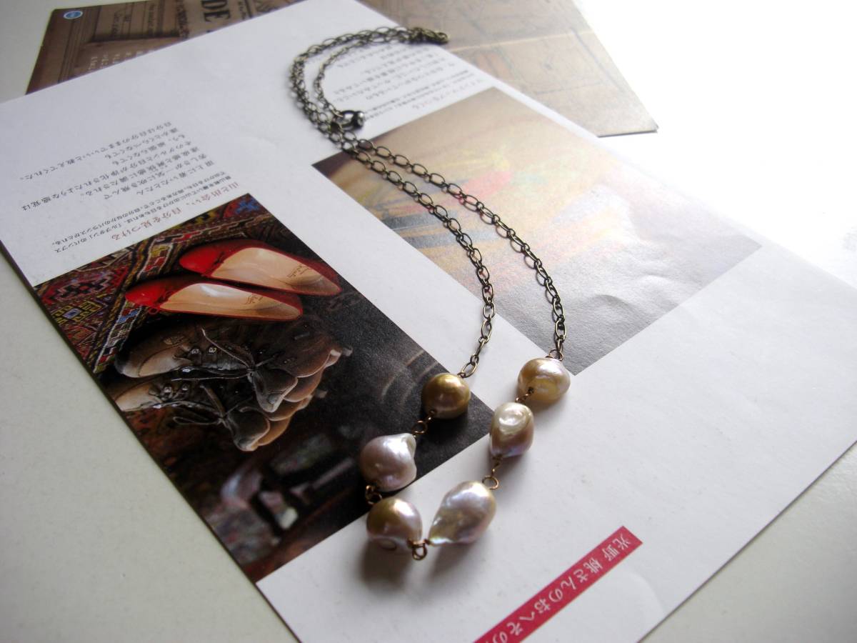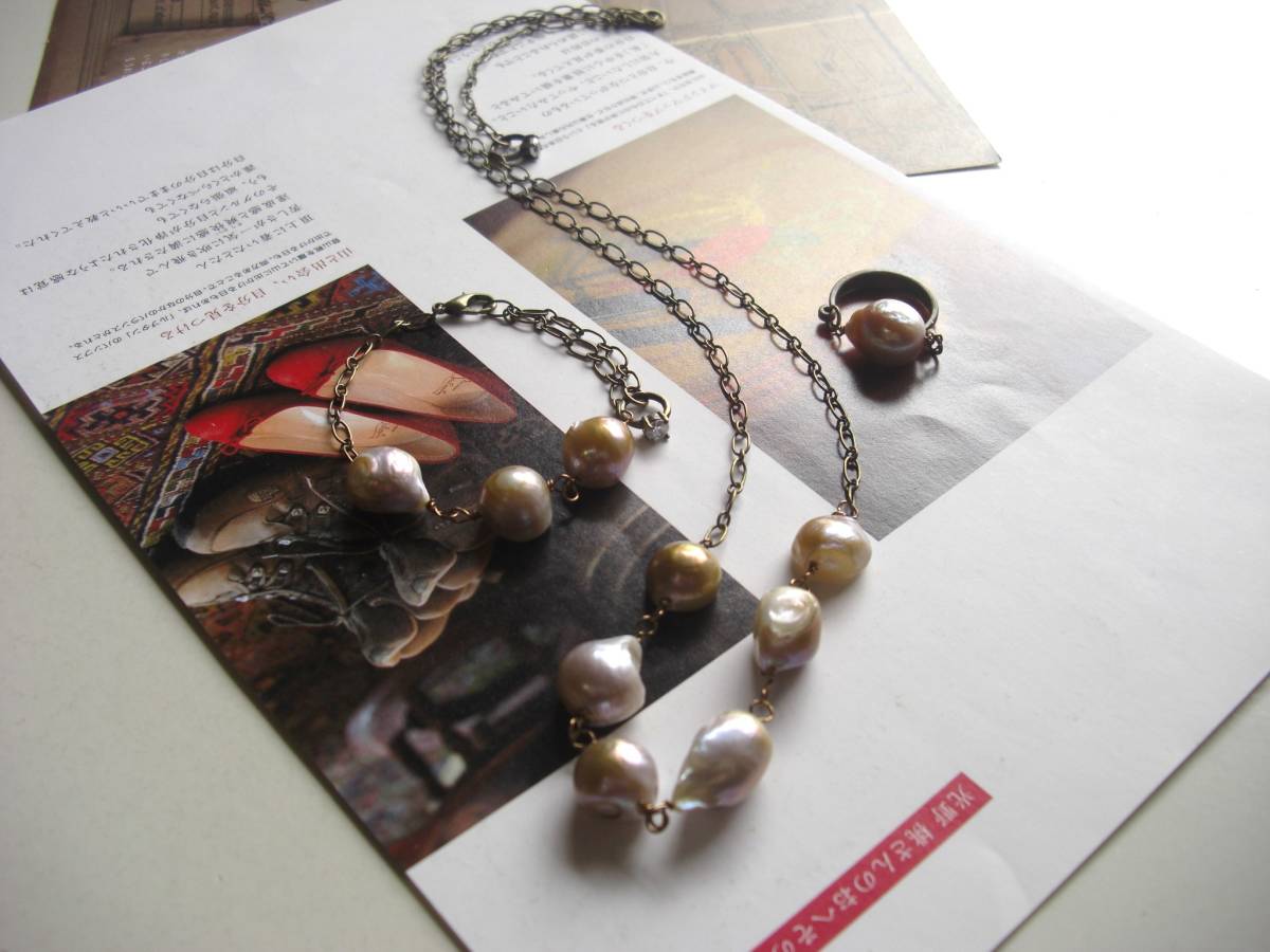 大人のあどけなさ・・シリーズです♪バロックバールの魔法・・個性的なバロックパールのシリーズです♪ネックレス、ブレスレット、リングの3点セットです♪パープルピンクの色合いがアンティークな表情です♪♪母貝つ きのバロックの淡水パールは11ミリから18ミリ位です♪ネックレスの長さは全長72センチ位で調節自由です♪チョーカー風に着けられても可愛いです♪ブレスレットの長さは22センチ位で調節自由です♪リングのパールは12×15ミリ位でサイズはフリーです♪それぞれ単品でも出品しています♪ハンドメイドを ご理解頂いてノークレーム、ノーリターンでお願いします