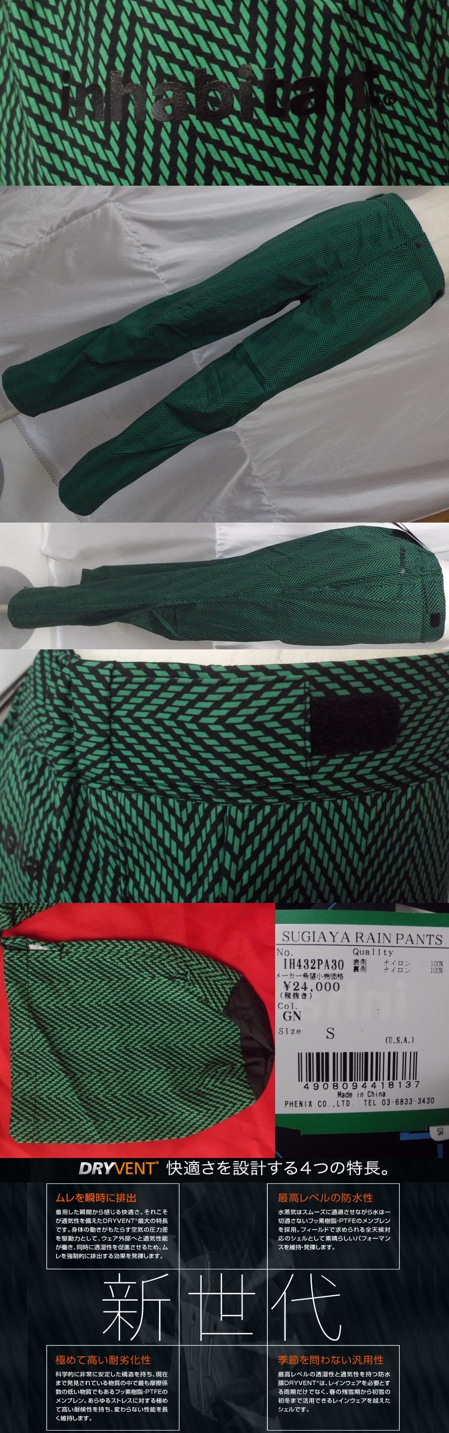 新品 インハビタント レイン パンツ inhabitant SUGIAYA RAIN PANTS サイズS:胴囲76~80㎝ 【耐水圧20,000mm/通気 伸縮】定価 26,400円 | ![]() | |||||||||||||||||||||||||||||||||||