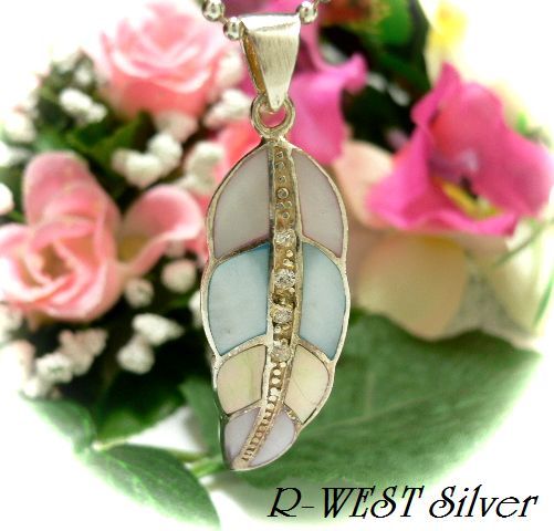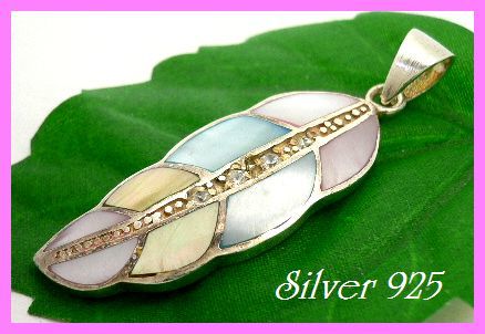 シルバー925銀のシェル貝殻入り ジルコニア付 フェザー型 ペンダント/パステルカラー