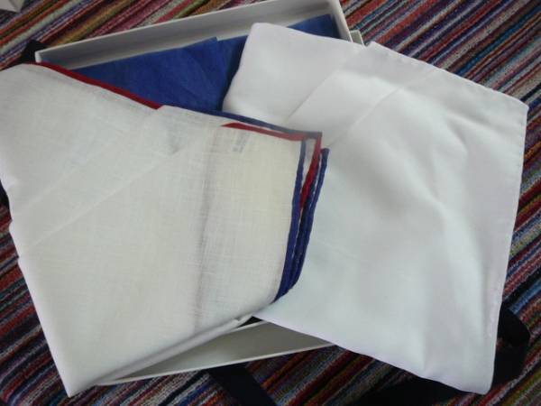 フレームカラーリネンブルーレッドハンカチ1枚 +無地ホワイトハンカチ1枚:2枚入り