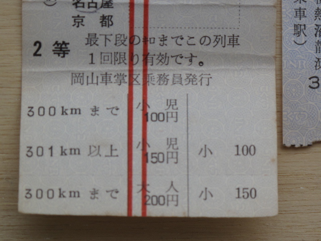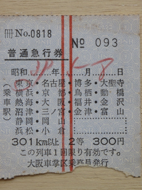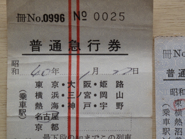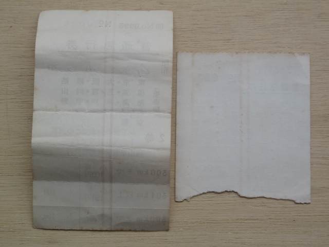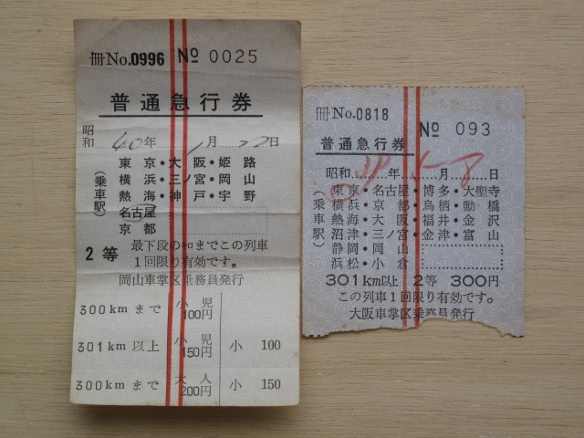 昭和39年と同40年に発行された、国鉄 車内急行券 2枚 です。 ① 昭和39年5月8日の日付のある、大阪車掌区乗務員の発行した、東京駅からの 2等 車内 急行券 300円券です。赤縦線2条。上下にミシン目。裏面は白紙。 ② 昭和40年1月22日の日付のある、岡山車掌区乗務員の発行した、名古屋駅からの 2等 車内急行券 200円券です。赤縦線2条。裏面は白紙。 いずれも淡青地で「JNR」「こくてつ」地紋。いずれも軟券。 サイズは①がタテ5.5cm×ヨコ5.0cm、②が8.8cm×5.0cm。 いずれも経年の変色・薄い汚れ・薄い小シミ・①の下端に欠損・②のヨコに何本かの折れがあります。 定形郵便110円でお送りします。 ★保存状態の記述は、あくまで個人的な評価ですので、保存状態に厳しい方は、入札をご遠慮願います。