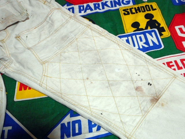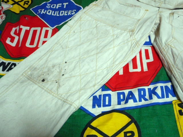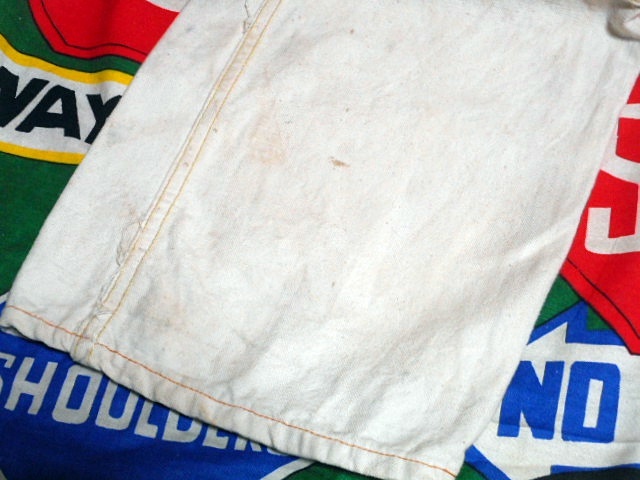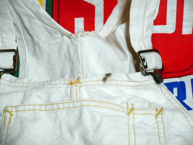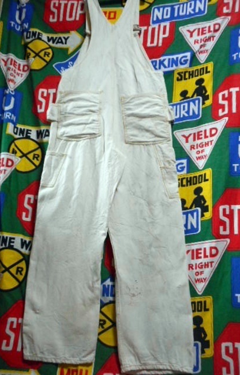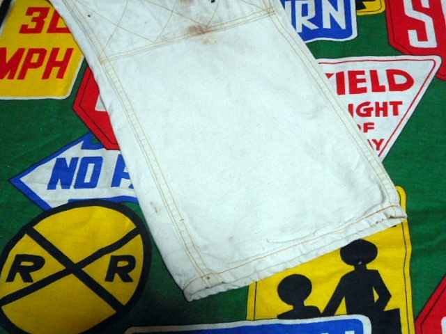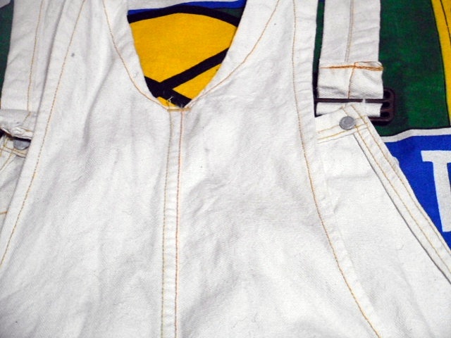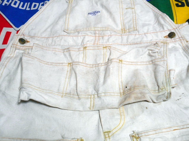 ボディーは厚みのあるホワイトダック、麻に近い様な記事感で、変わったポケットの付け方、ダブルニー、ワークエプロンとディティール満載の1着で、ワークウェアー好きな方にもオススメなビンテージオーバーオールです。