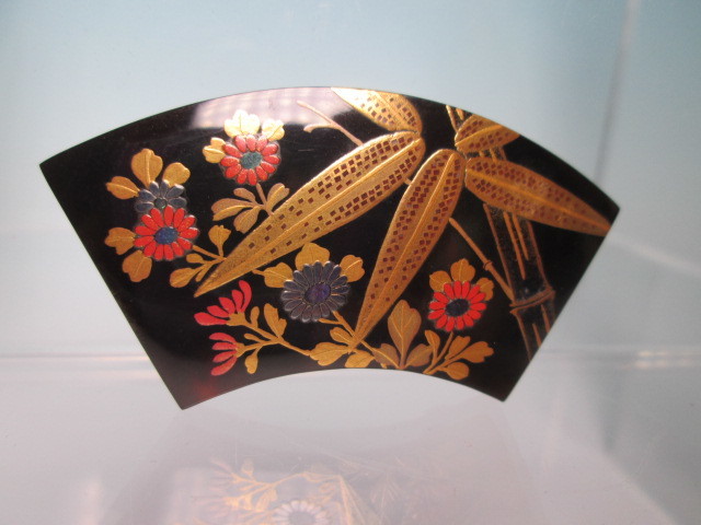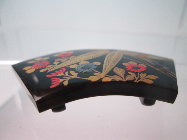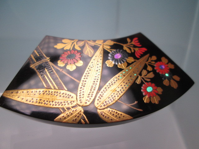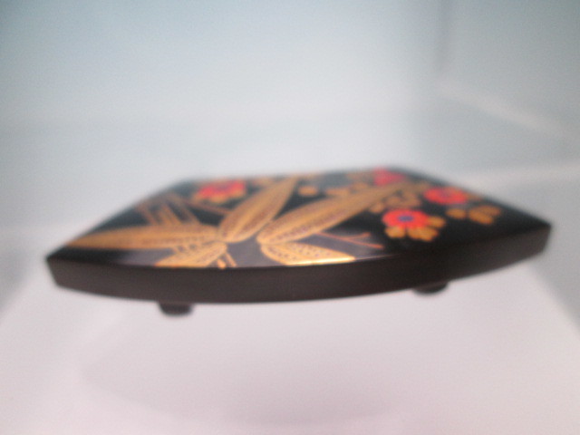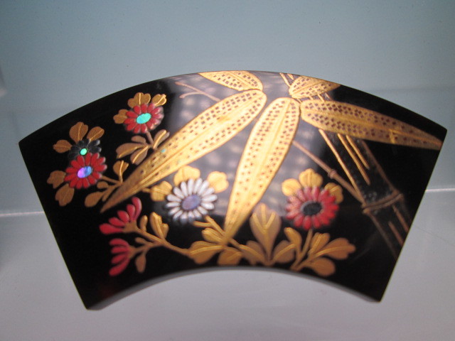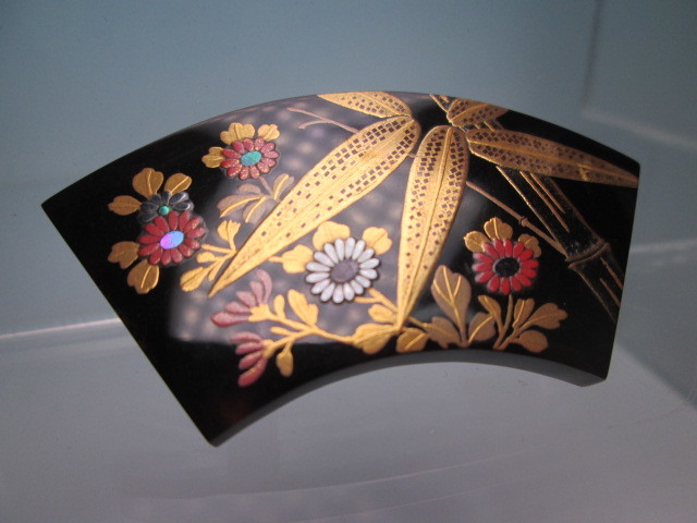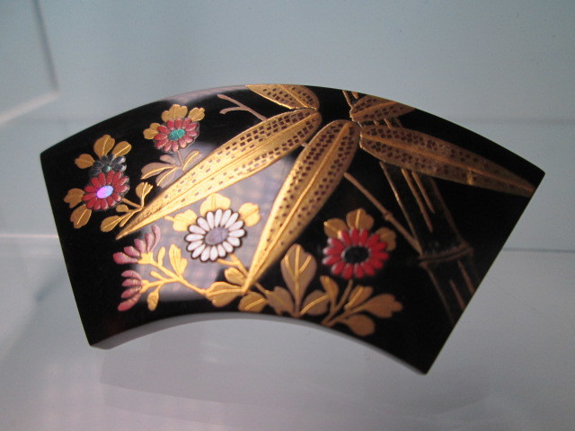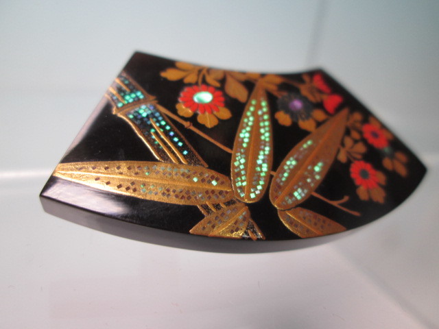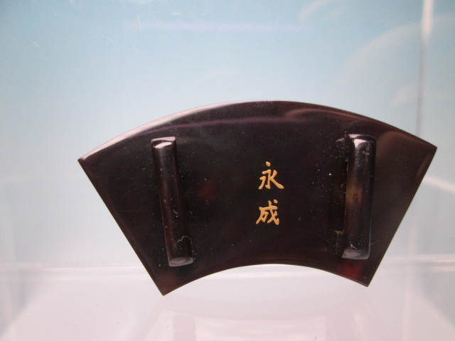 ☆永成作 本鼈甲 竹と菊花図 螺鈿細工 金蒔絵の帯留め 未使用品