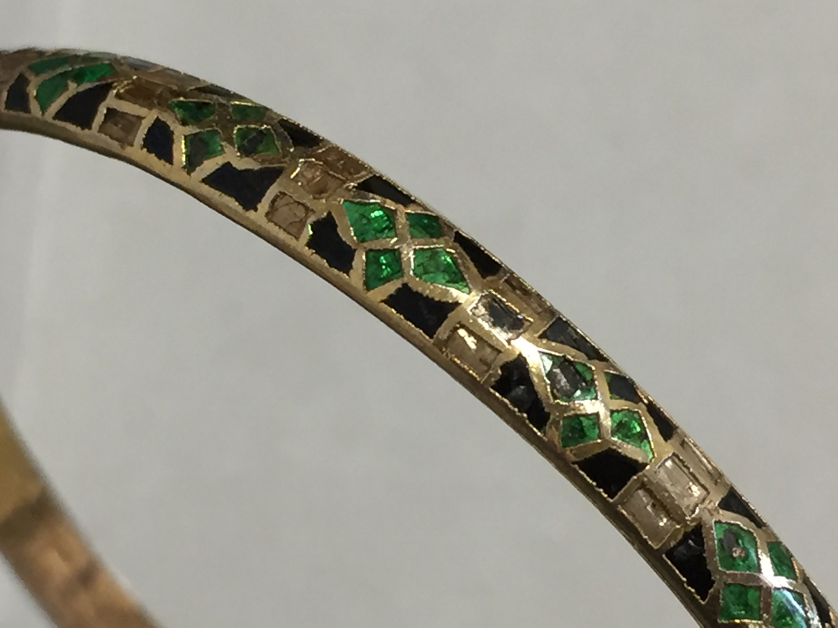 アンティークの七宝焼を使用した、デザインバングルです。金属面に一部、変色があります。